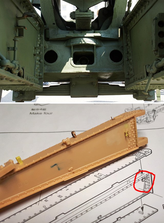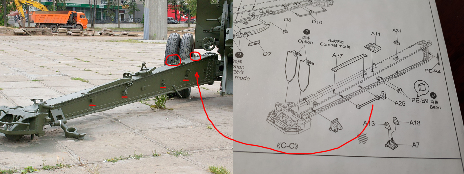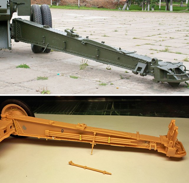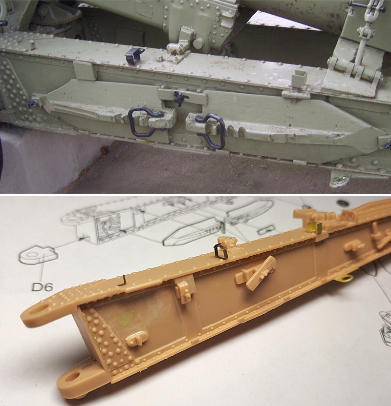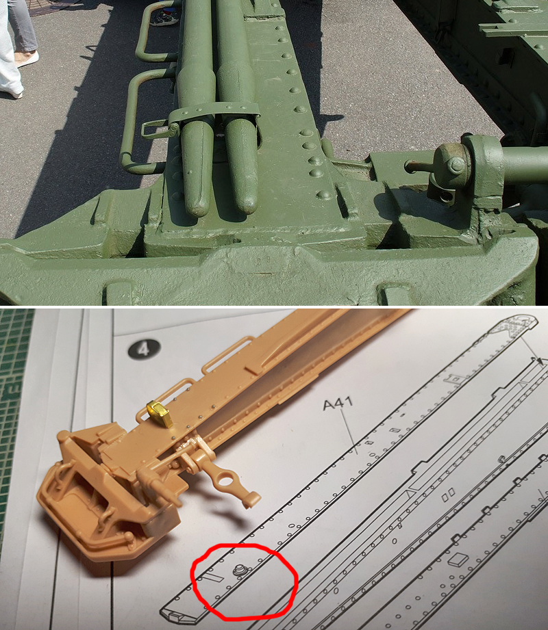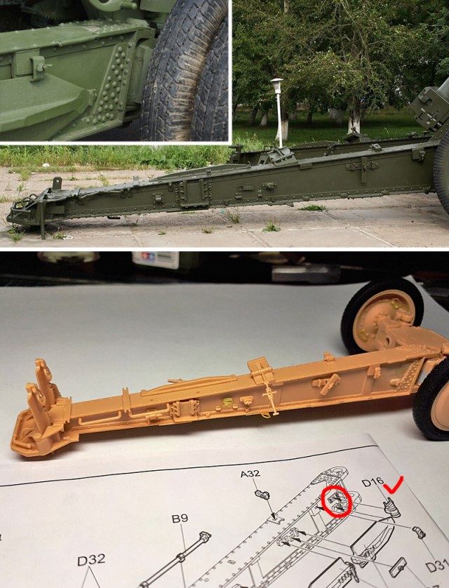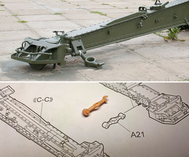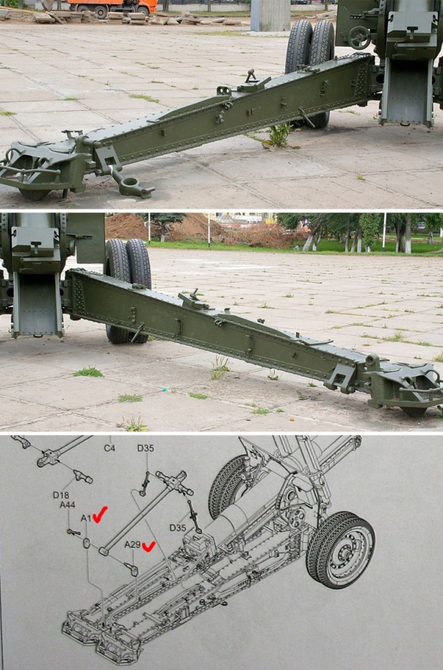 Судя по фотографиям оригинала, на деталях из набора ниже требуемого стоят цапфы установки механизмов в упоры люльки. Так как доработка потребует изготовления для них новых бронировок (а с жестью я работаю оч.плохо), решил оставить все как есть.