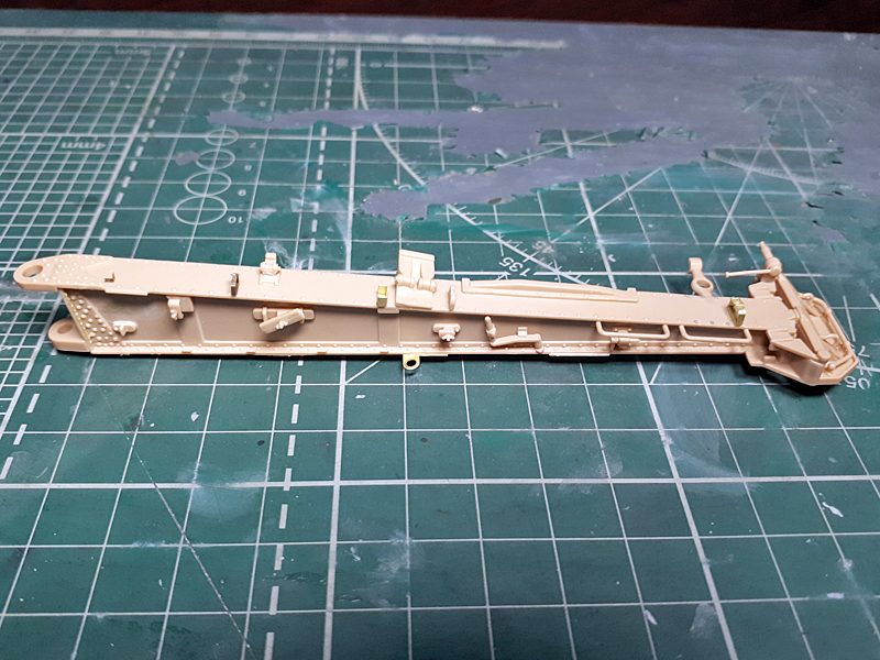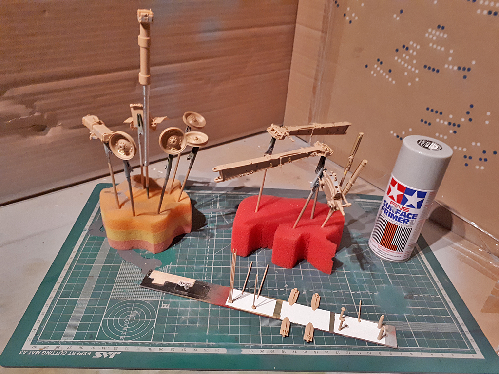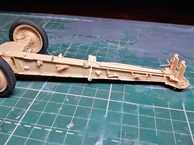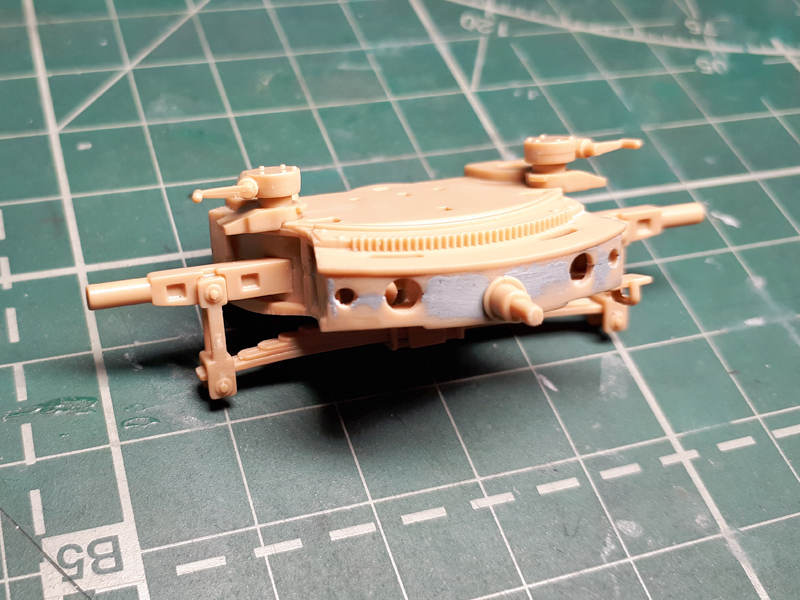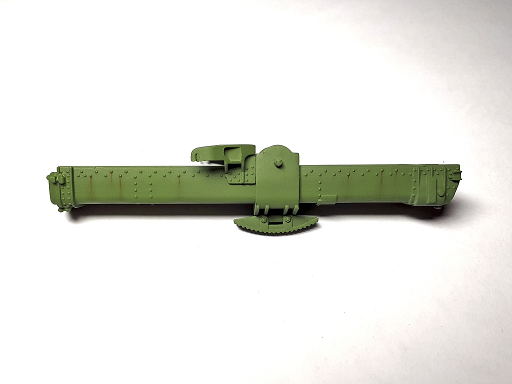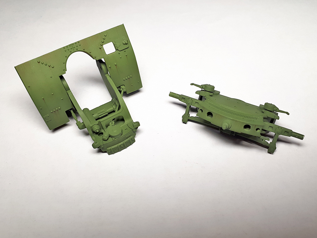 Далее, приступил к окончательной сборке с параллельным нанесением сколов, потертостей и загрязнений. На данный момент собрал воедино верхний и нижний станки, люльку с уравновешивающими механизмами и станины. Навесил шанцевый инструмент. Сколы привычно делал акриловыми красками от Vallejo (70.822 - черно-коричневая) и Тамии (xf-56 - metallic grey). Далее, слегка прошелся по поверхностям черным пигментом от Wilder. То что получилось, представляю на фотографиях. Но это еще не окончательный вариант. Будет корректировка + запыление пигментами земляных оттенков и пыли.