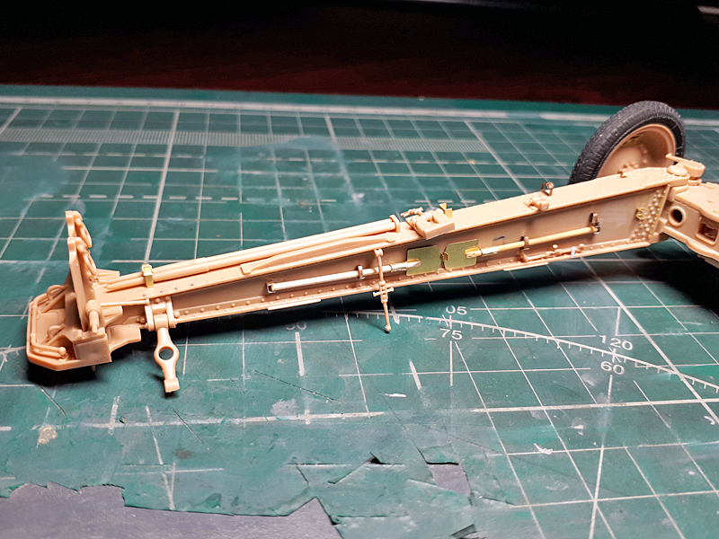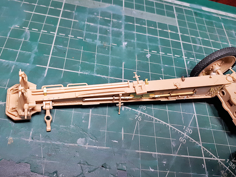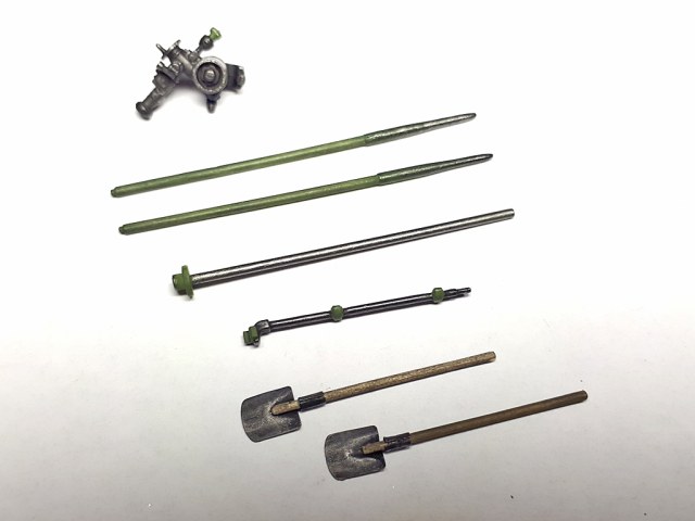 На внутренней стороне станины сделал из пивжести и остатков фототравления отсутствующие в наборе упоры и замки для крепления лопат. Черенки лопат выточил из зубочисток. Штыки - взял из набора шанцевого инструмента от Микродизайна. Там же, в дополнение к перенесенным с правой станины упорам, из остатков фототравления сделал замок для пока неустановленного мною инструмента.