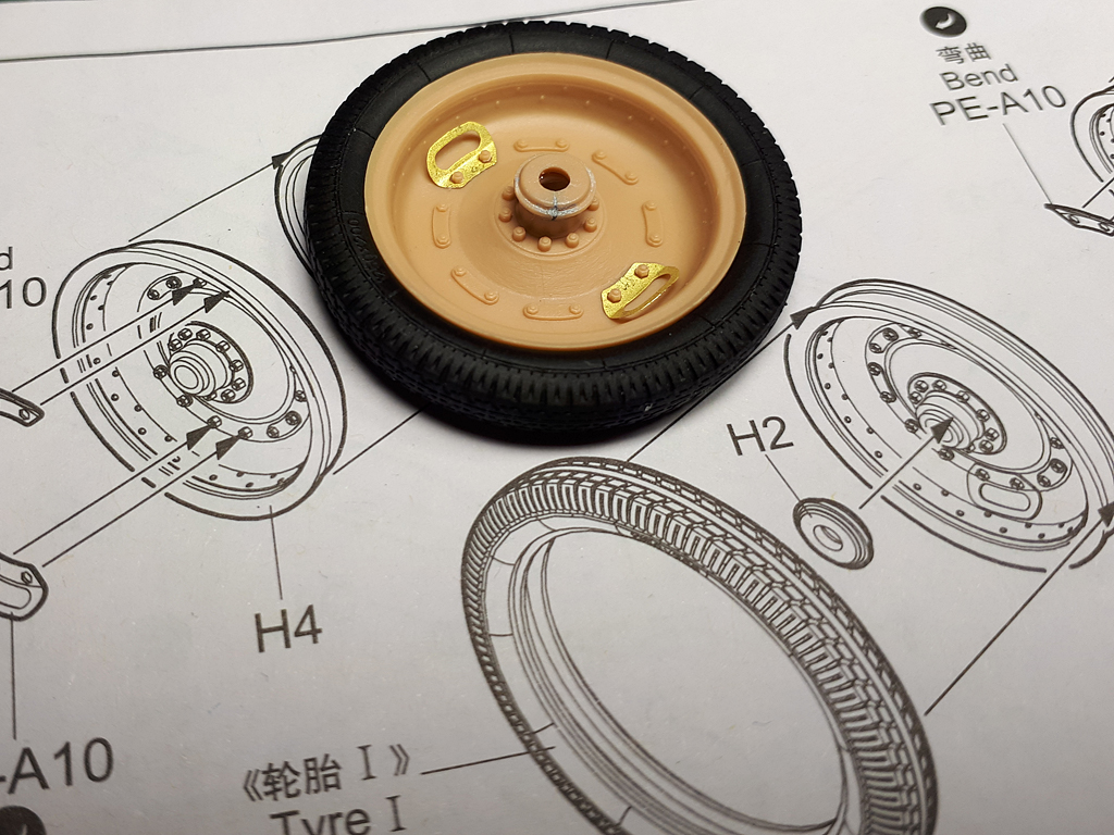Впечатление от результата, двоякое. С одной стороны имеем отличное качество литья у пластика с хорошей проработкой мелких деталей, а на резиновых шинах - великолепный четкий протектор. С другой - есть вопросы к копийности этих колес. Если не вдаваться в детали, то конечно выглядят они похоже на оригинал. Однако, при внимательном рассмотрении, картина не совсем радужная. Так, с внешней стороны на ступицах отсутствуют "ушки", а с внутренней - заклепки на фланце. Эти элементы очень мелкие, и с учетом масштаба, думаю, ими можно пренебречь т.к. по любому они получатся сильно переразмеренными. Но вот что делать с неверным количеством объединенных в пары стопорными пластинами болтов, соединяющих диски колеса? В реальности их 10 пар. На колесе из набора - 8. И это несоответствие (если конечно о нем знаешь )) ) сразу бросается в глаза. При этом расположены они в таком месте, что срезать и зачистить их, не повредив колесо, по крайней мере у меня нормально не получится. Если начну делать, боюсь запорю. Поэтому все-таки принял решение оставить колеса как есть.