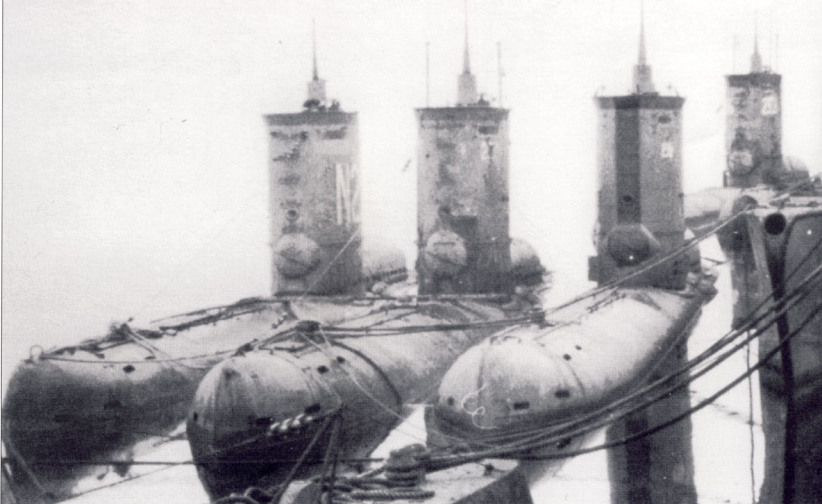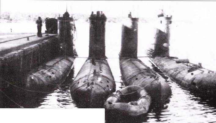 Пять еще не оснащенных оборудованием кормовых секций № I на итальянской верфи "Ансальдо" в Генуе. Постройка подлодок XXIII серии в районе Средиземного моря значительно затянулась. К началу июля 1944 года немецкие верфи изготовили секции для 8 подлодок и отправили их но железной дороге. Однако не все они прибыли в Италию. Причиной стал коллапс на железных дорогах, подвергавшихся регулярным воздушным налетам. Сборка секций должна были начаться в Генуе и Моyфальконе в мае 1944 года. Однако к сборке подлодок так и не удалось приступить, так как на территорию Италии вскоре высадились американские войска.
