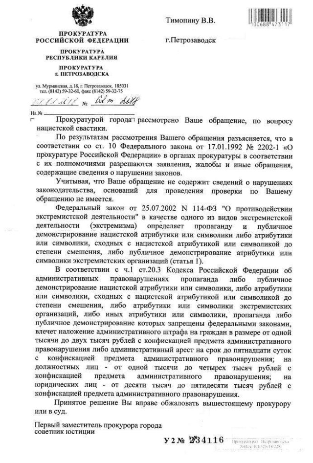 я, решив прояснить неоднозначную трактовку Законов РФ в отношении демонстрирования свастики на моделях, направил в Карельскую Прокуратуру заявление с таким текстом: