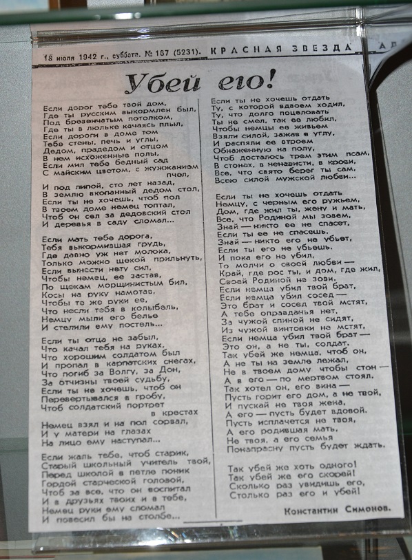 Владислав, вот Вам еще один повод "почесать репу и пошевелить мозговой извилиной". :-) Один из экспонатов выставки - распечатка из газеты "Красная звезда" с широко известным стихотворением Симонова. Оно даже в школьную программу входило раньше. Вы его конечно знаете, но перечитайте еще раз текст, проникнитесь мощью! Так вот, с точки зрения современной юриспруденции или "педропейских ценностей" - что это??? Что иное, как не призыв к массовым убийствам, разжиганию межнациональной розни и ненависти. Настоятельная рекомендация убивать именно немцев!