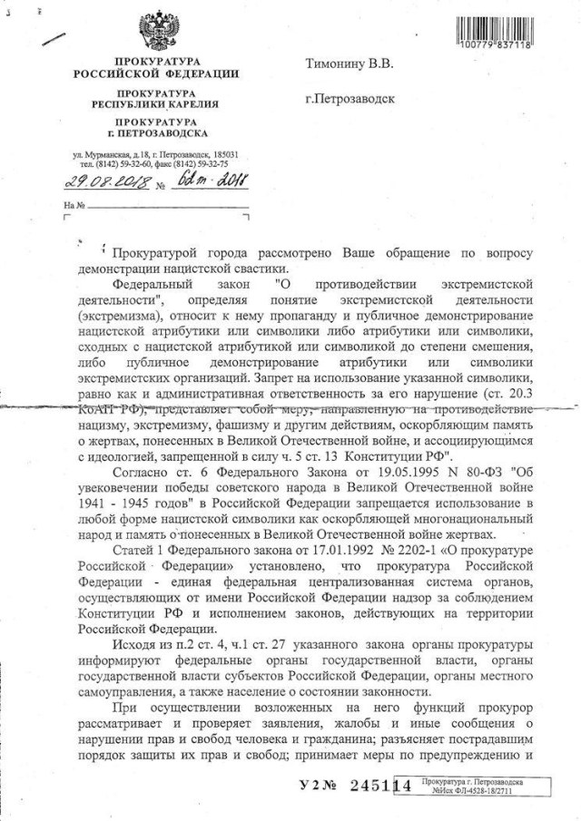 Снова отписка. Тупым прокурорским чинушам сперва нужен факт демонстрации/факта нарушения/еще какого либо "применения" свастики, чтобы дать ответ на вопрос. Тема сисек не раскрыта. Хотя, написали, типа низззя сперва. Интересно, если к обращению приложить модельку Худого со свастиками, чтобы эти умники написали...