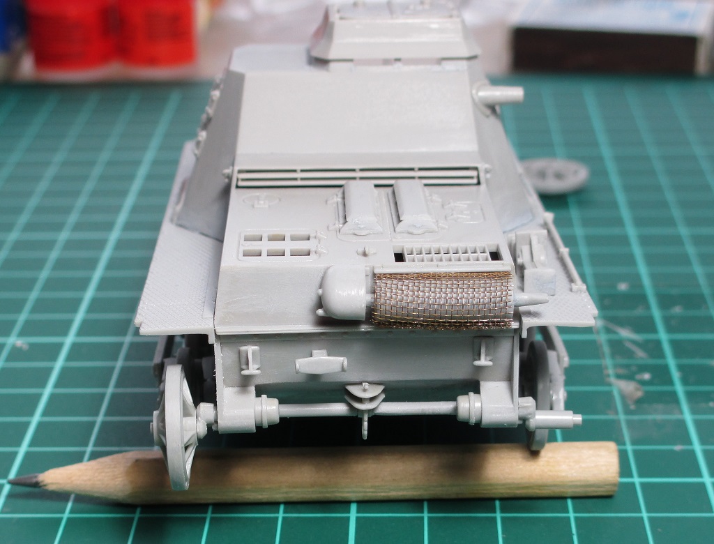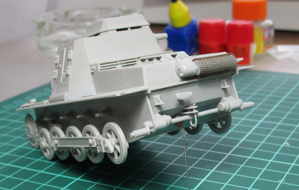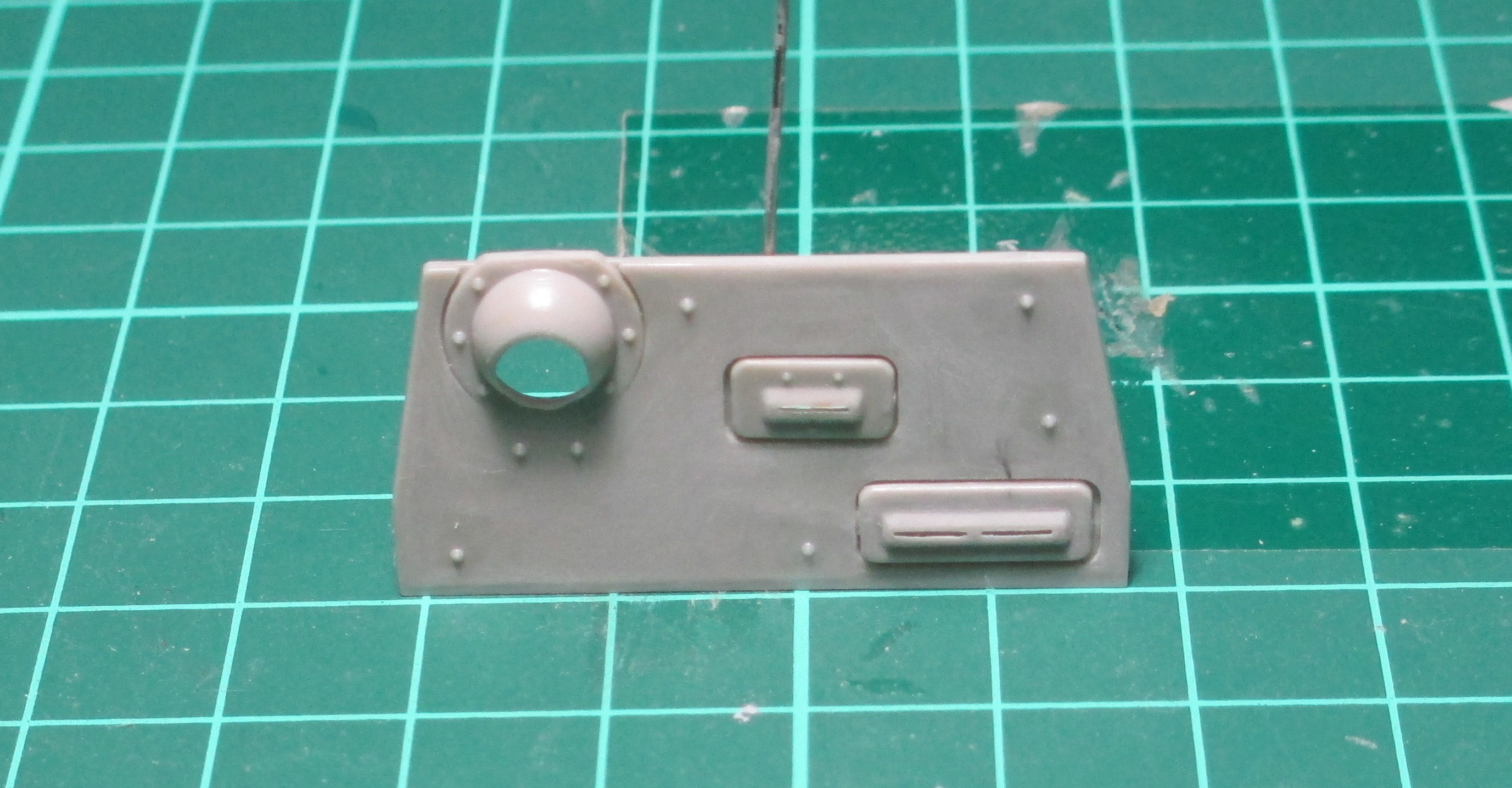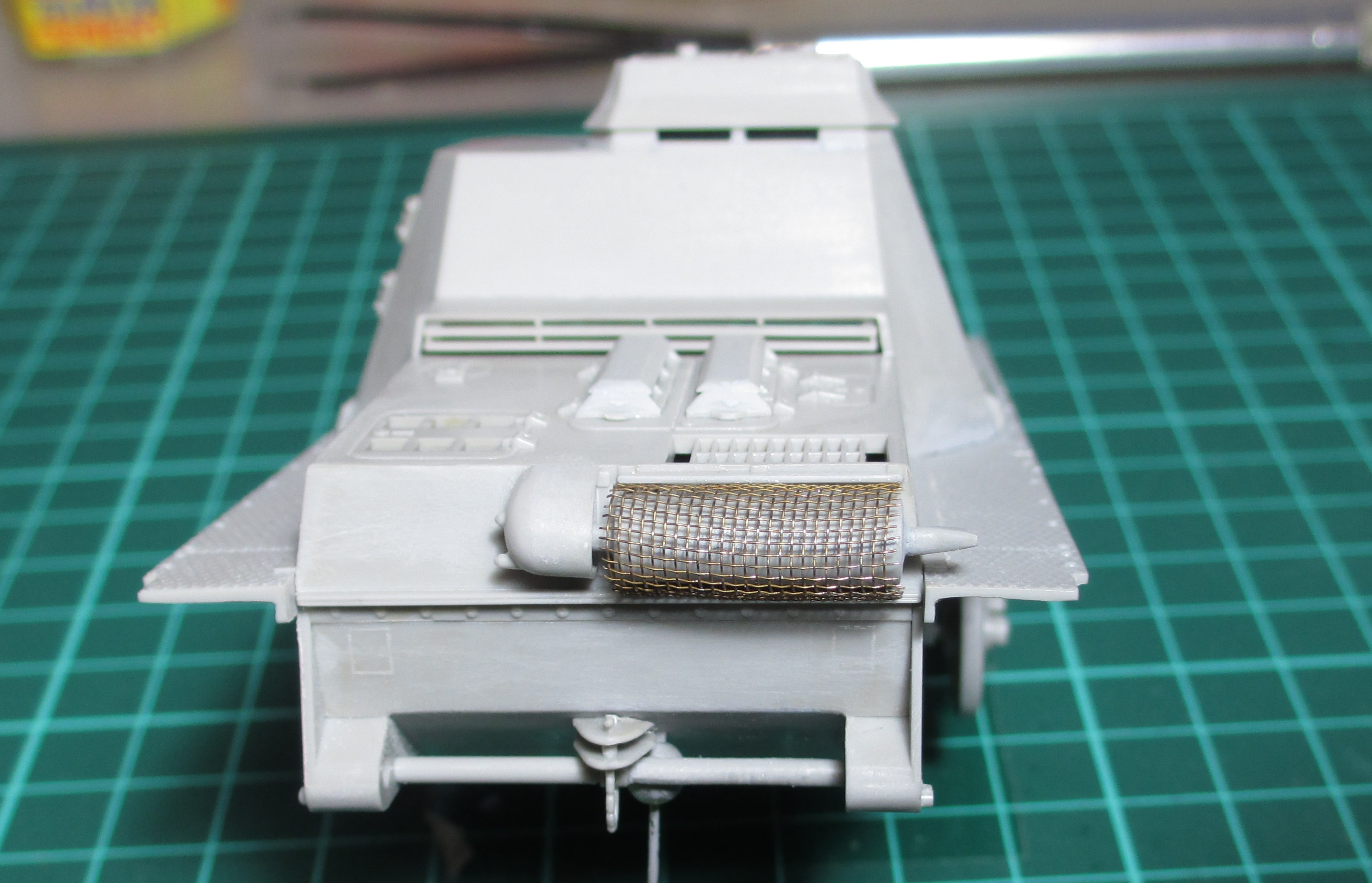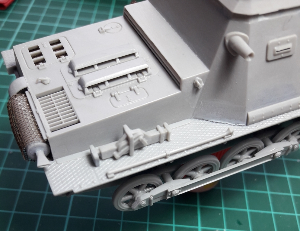 Так же пришлось накидать шпатлевочки в щель,которая образовывалась в результате совмещения лицевого бронещитка на ком,башенке.Кормовую часть дорабатывать особо не пришлось-разве что установил сеточку на лючке и проперфорировал лючки.