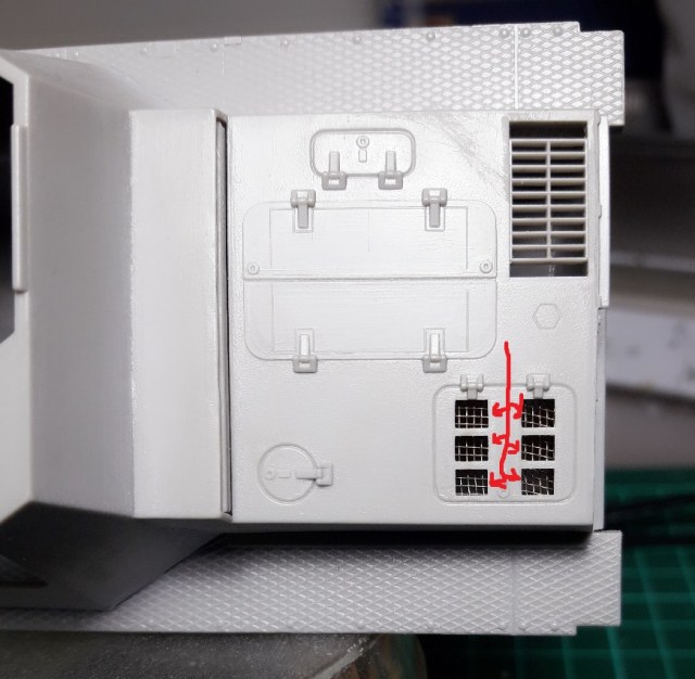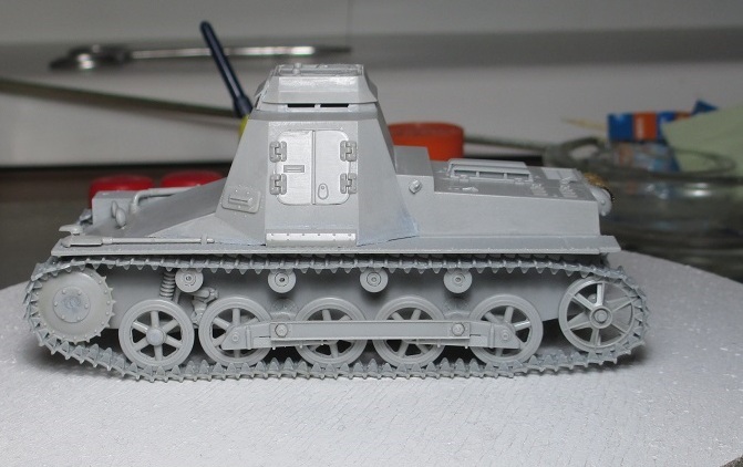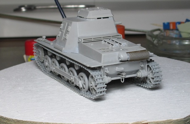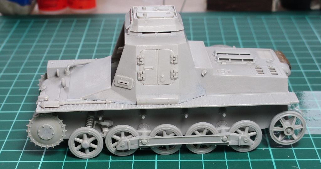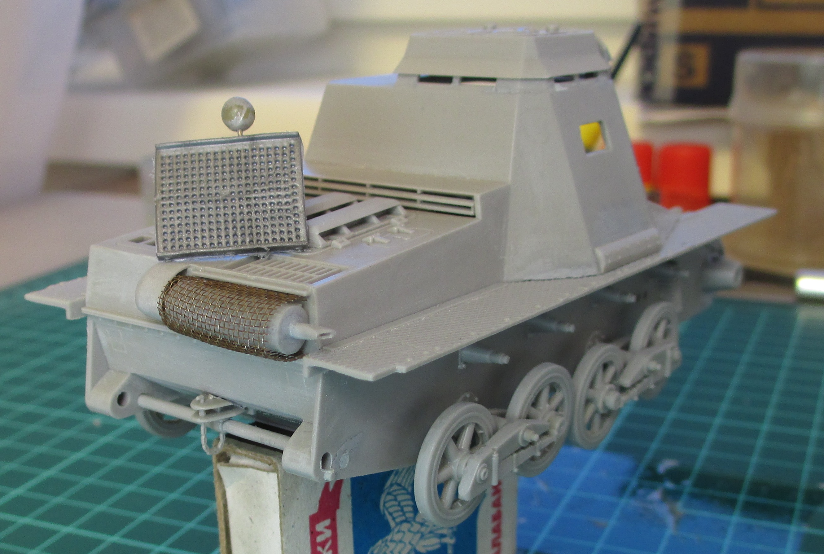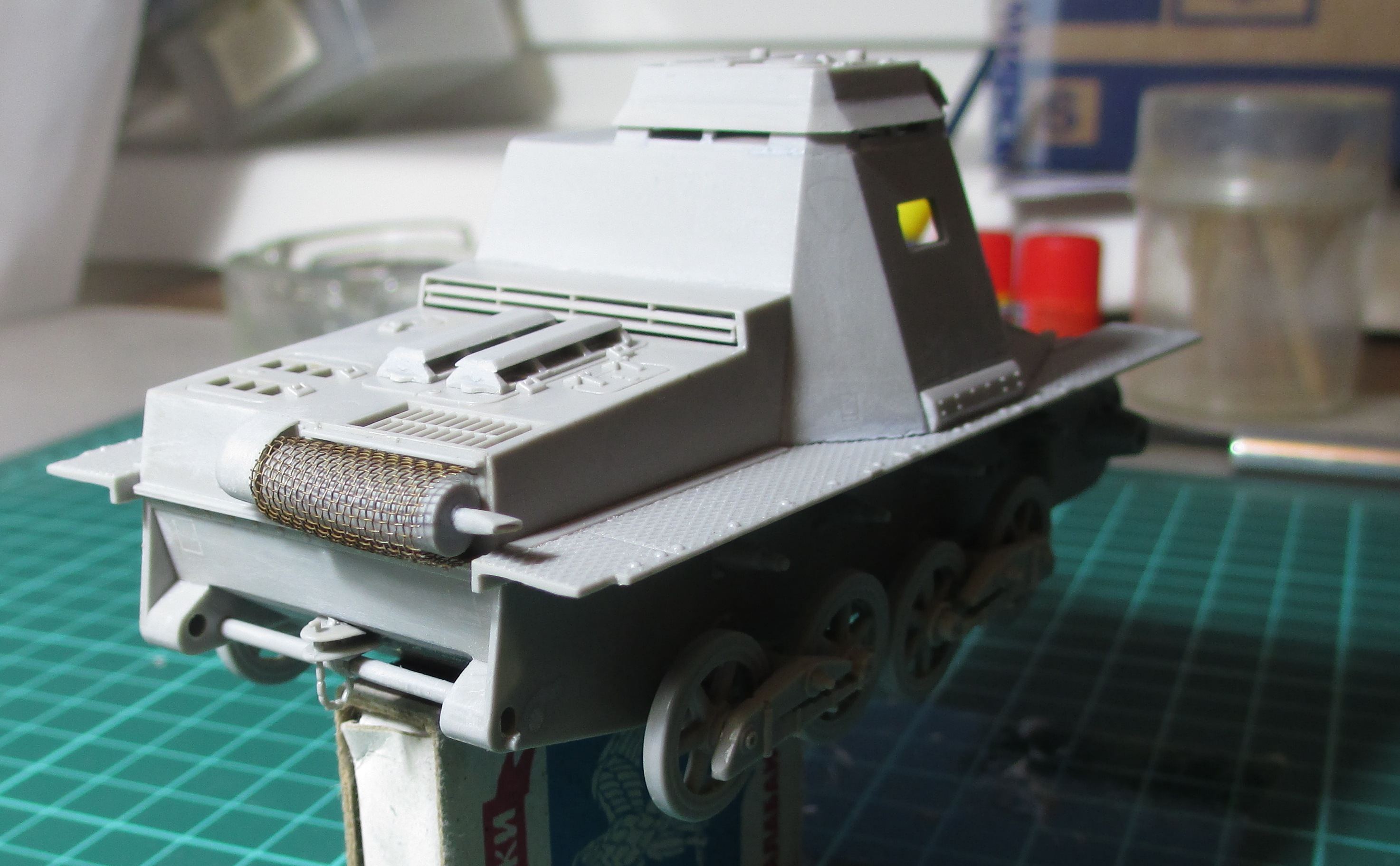 Так же пришлось накидать шпатлевочки в щель,которая образовывалась в результате совмещения лицевого бронещитка на ком,башенке.Кормовую часть дорабатывать особо не пришлось-разве что установил сеточку на лючке и проперфорировал лючки.