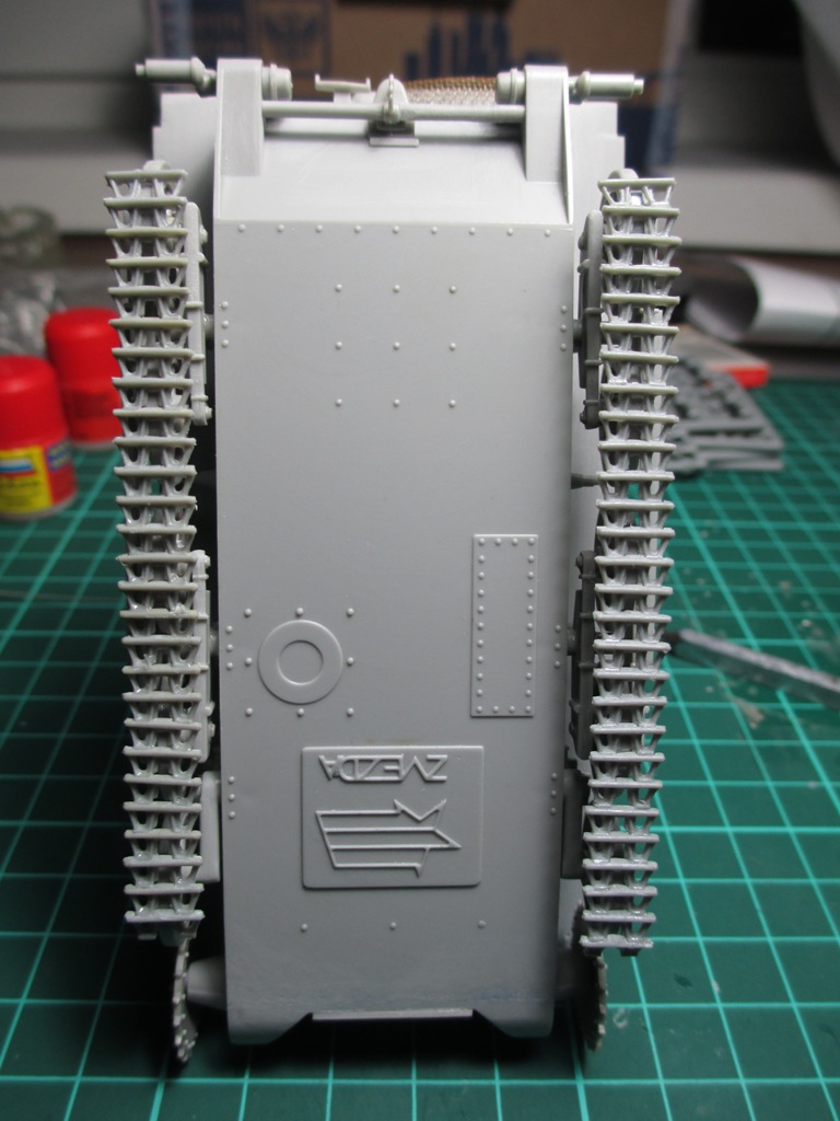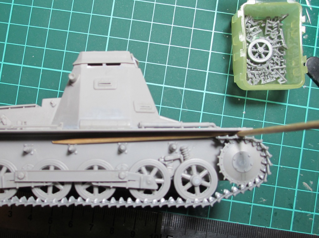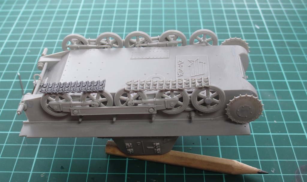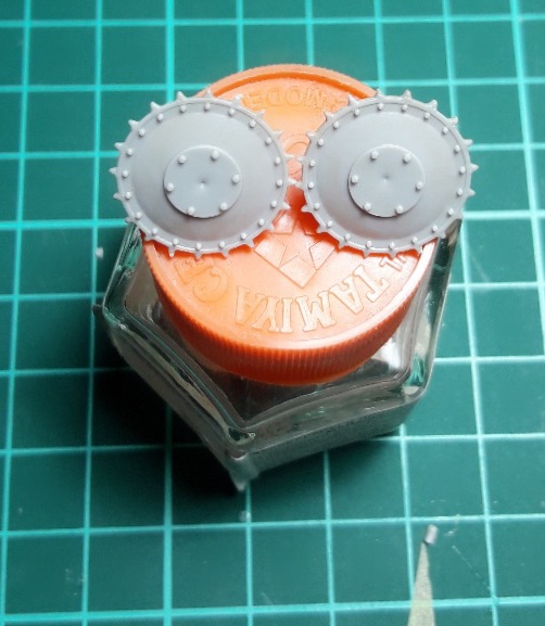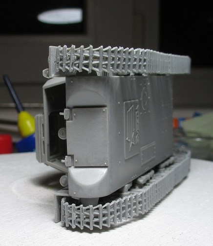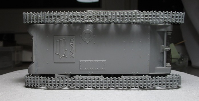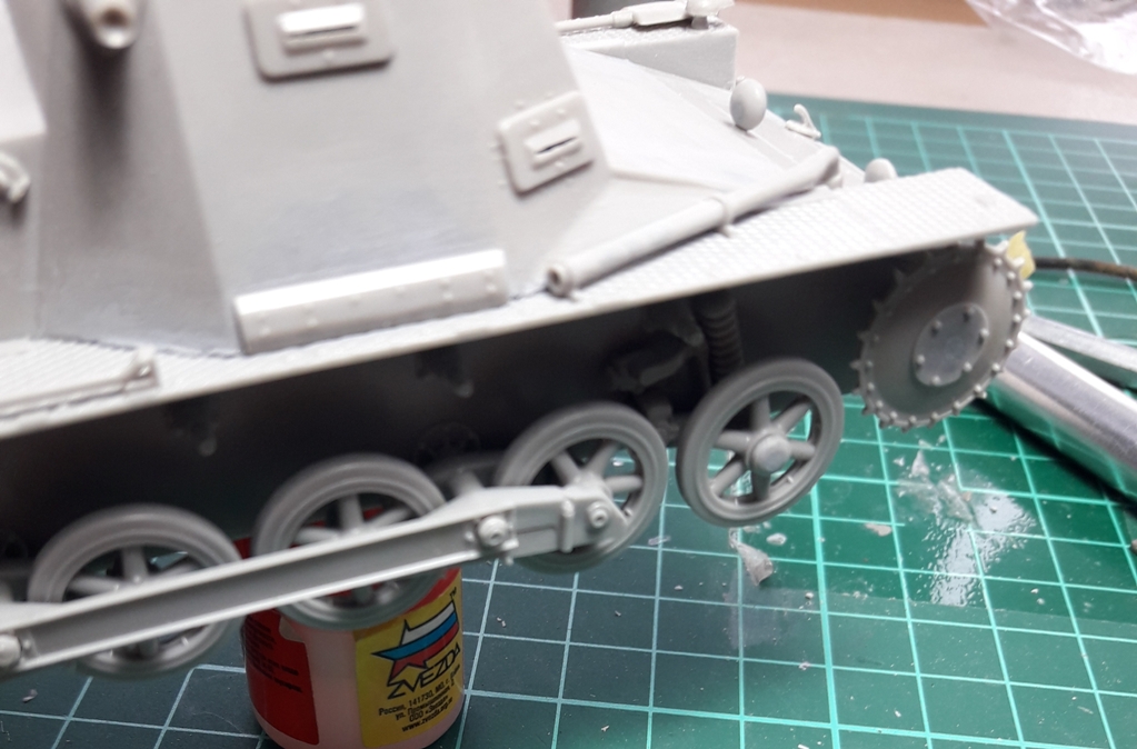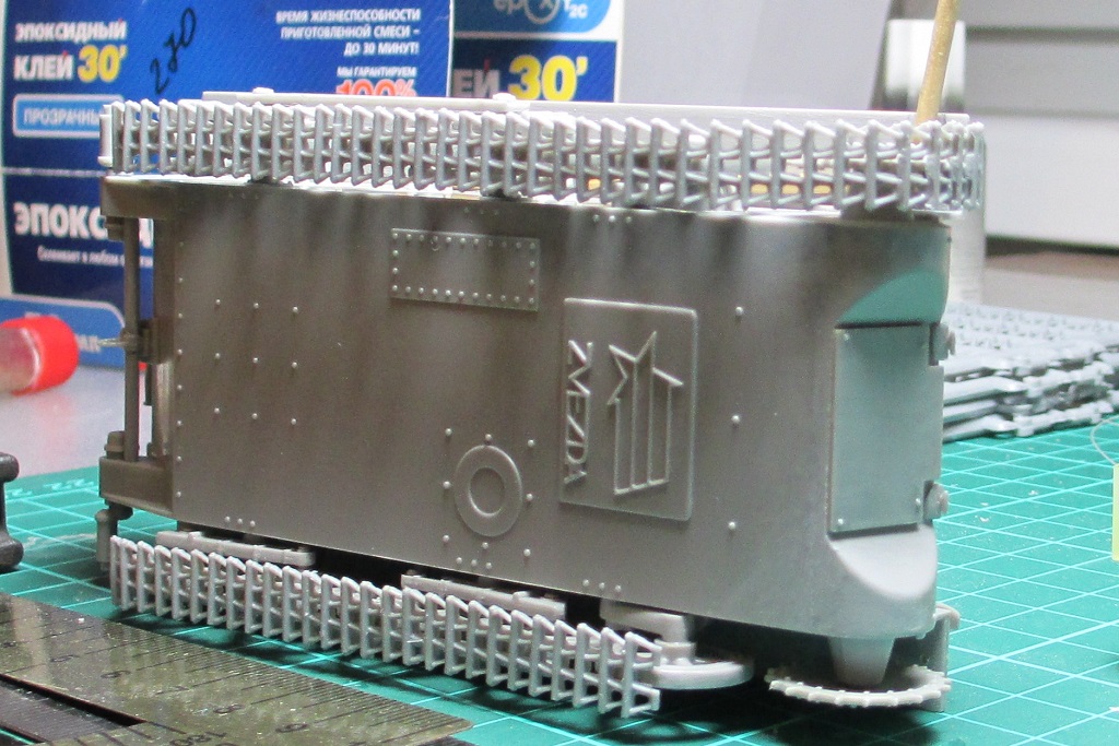 Касаемо сегодняшнего объема работ:собрал и отчасти установил ходовую .Когда дело дошло до звездочек выяснилось,что по центру имеются жирные при жирные утяжины.Пришлось обратится к помощи шпатлевки. И еще -на звездочках некоторый сдвиг пресс-форм,соскребается просто ножом.Поддерживающие катки не выставляю-их там целых восемь и особого интереса они не представляют.Собираются из двух частей влегкую.