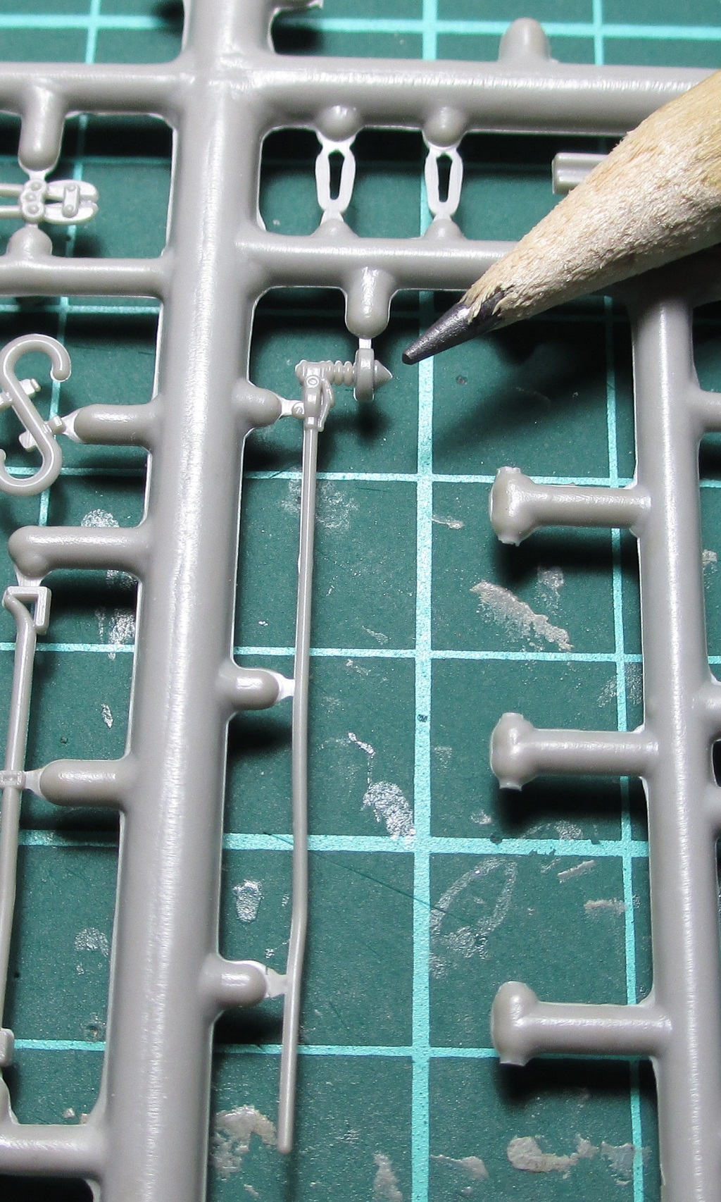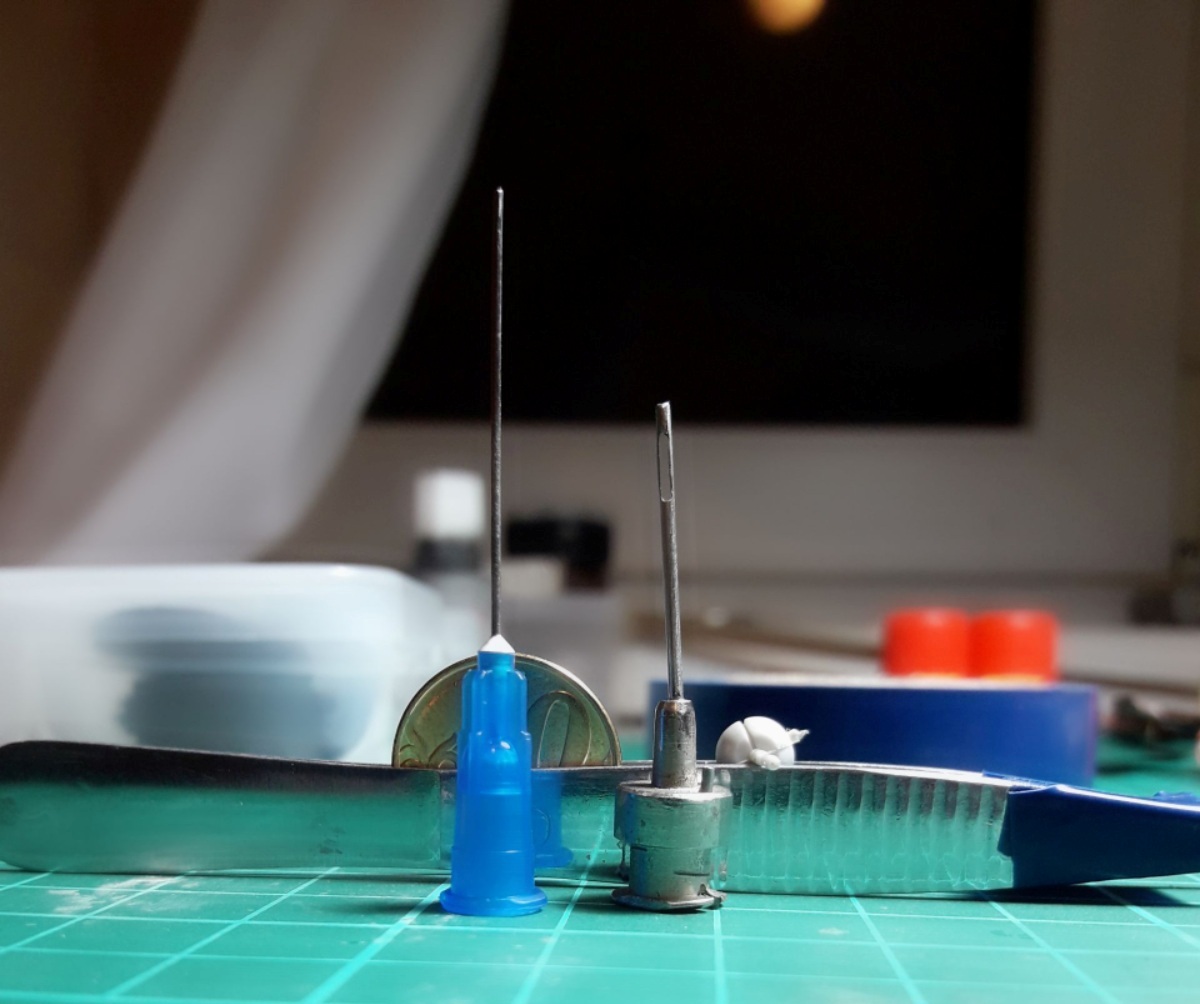Доброго времени суток.Необходимое количество траков я нарубил -просто жду выходных,что-бы продолжить монтаж траков.Сегодня занялся антеной.Вот то,что предлагает производитель.Несколько дубоватая и уязвимая в процессе покраски и тонировки деталь.Крепежь привел в должное состояние;из пункционной иглы сделал новую.