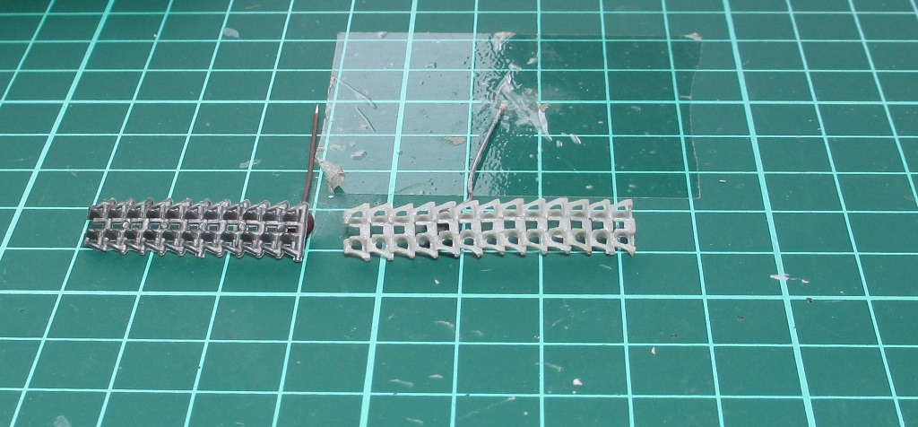 Качество -где-то на "троечку"(много облоя),но касаемо сбора самой ленты -после зачистки сегменты легко собирются воедино. Сегодня,если выкрою время,то настрогаю этих траков побольше.Вопрос к коллегам:ни кто не знает сколько было траков у Т1?