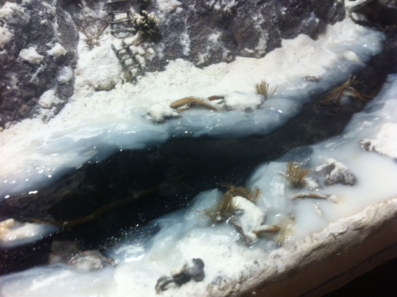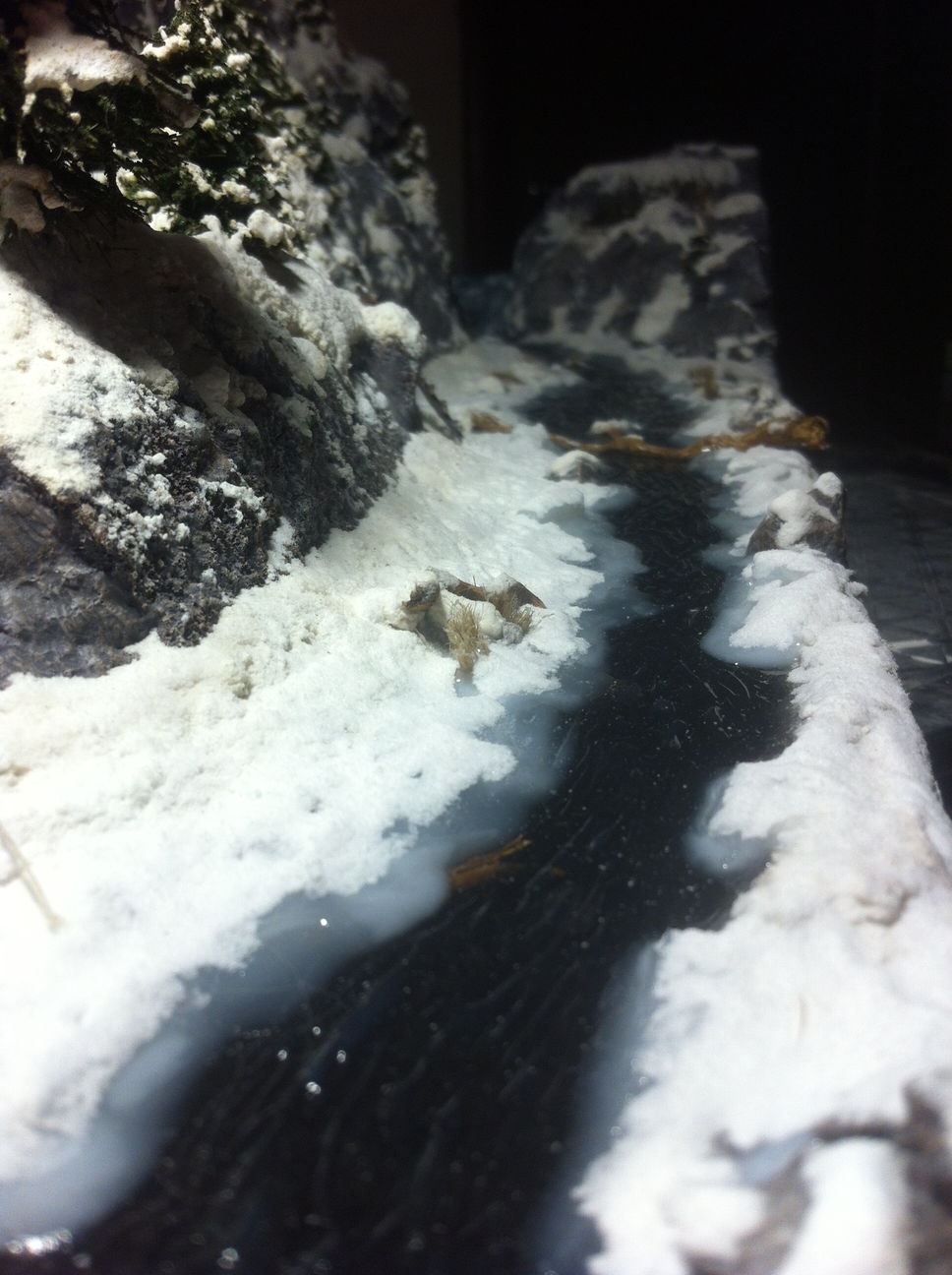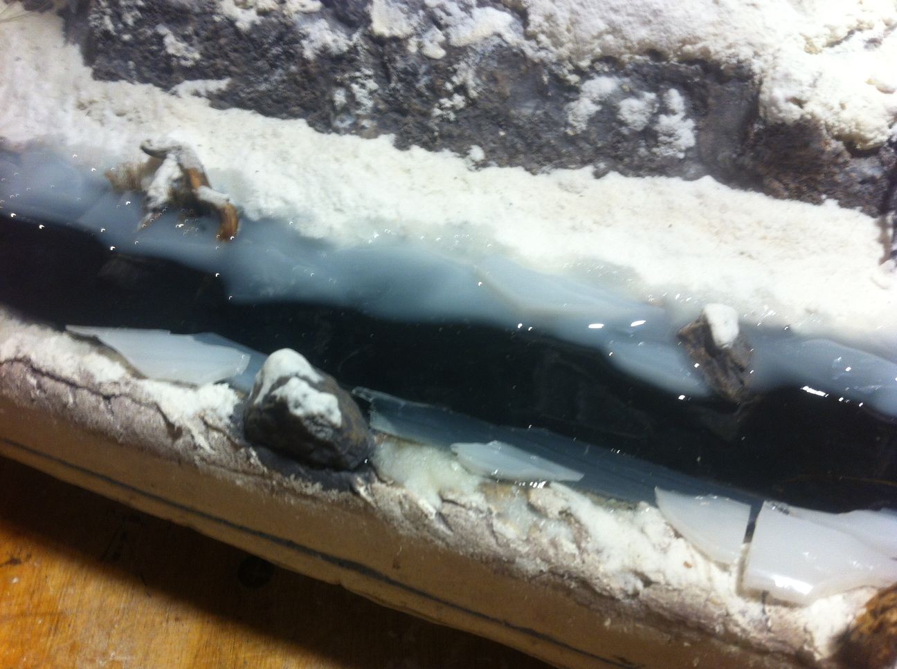 и так продолжаю речку - расколол белую смолу, выложил по краям реки, залил полупрозрачной смолой, потом пролил более белой по цвету. теперь буду засыпать берега снегом (содой). по началу прям отстой какой то получился. сейчас вроде ничего. (все делаю первый раз) так что тапками прошу сильно не кидаться)))))