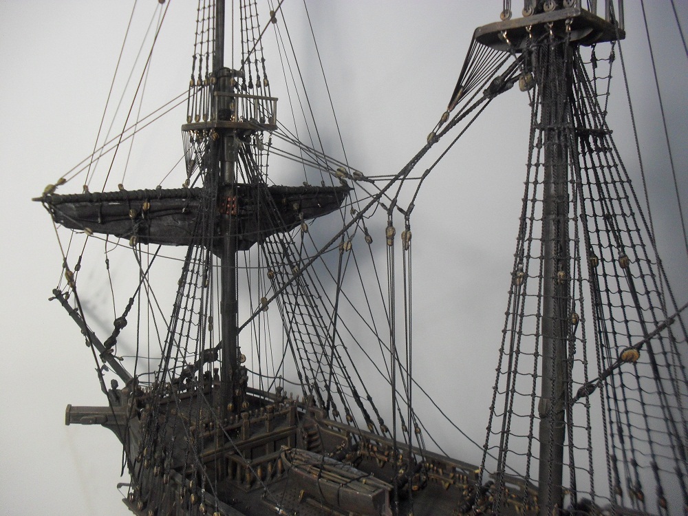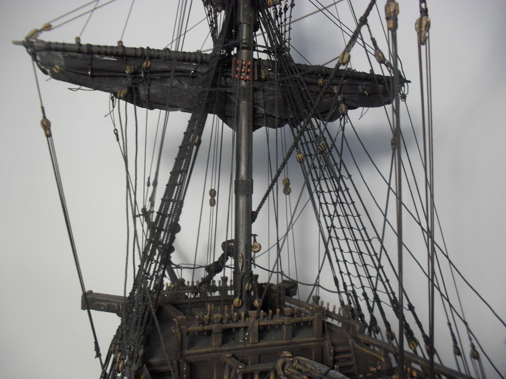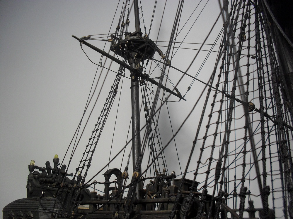 ...с бизанью все сложнее; очень жалко не ставить ее, так как это характерная черта старинных судов, но вы обнаружите, что очень трудно поставить ее правильно. Но все таки это можно сделать при помощи терпения и находчивости, а тот кто разработал такелаж модели и поставил его с парусами, обязан обладать обоими этими качествами."