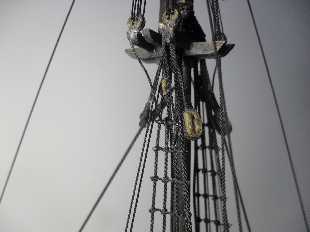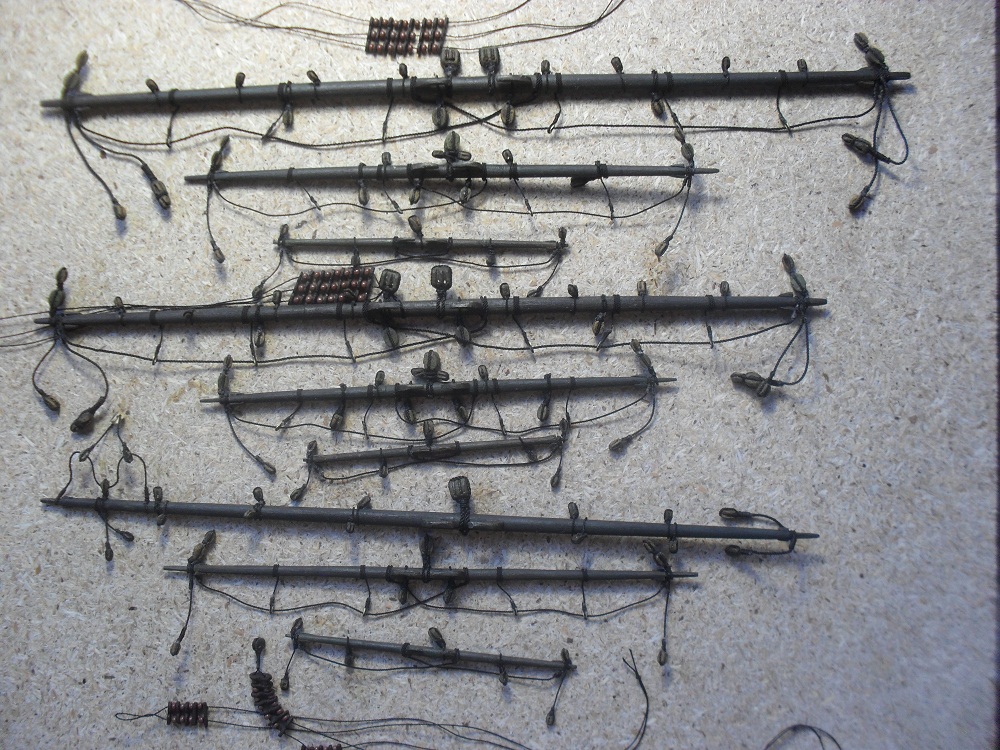 И снова всем привет! Обтянул стеньги и брам-стеньги. Повесил блоки драйрепов. Можно приступать к вязке выбленок