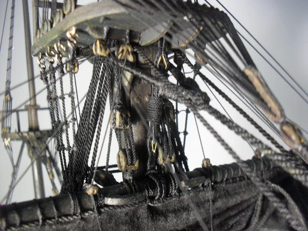 Всем привет! Бегучий такелаж фока и фок-реи. Тали нок-горденей на этот раз через комель-блоки и блоки на шкентеле на топе стеньги. И рей-тали привел к рымам на русленях