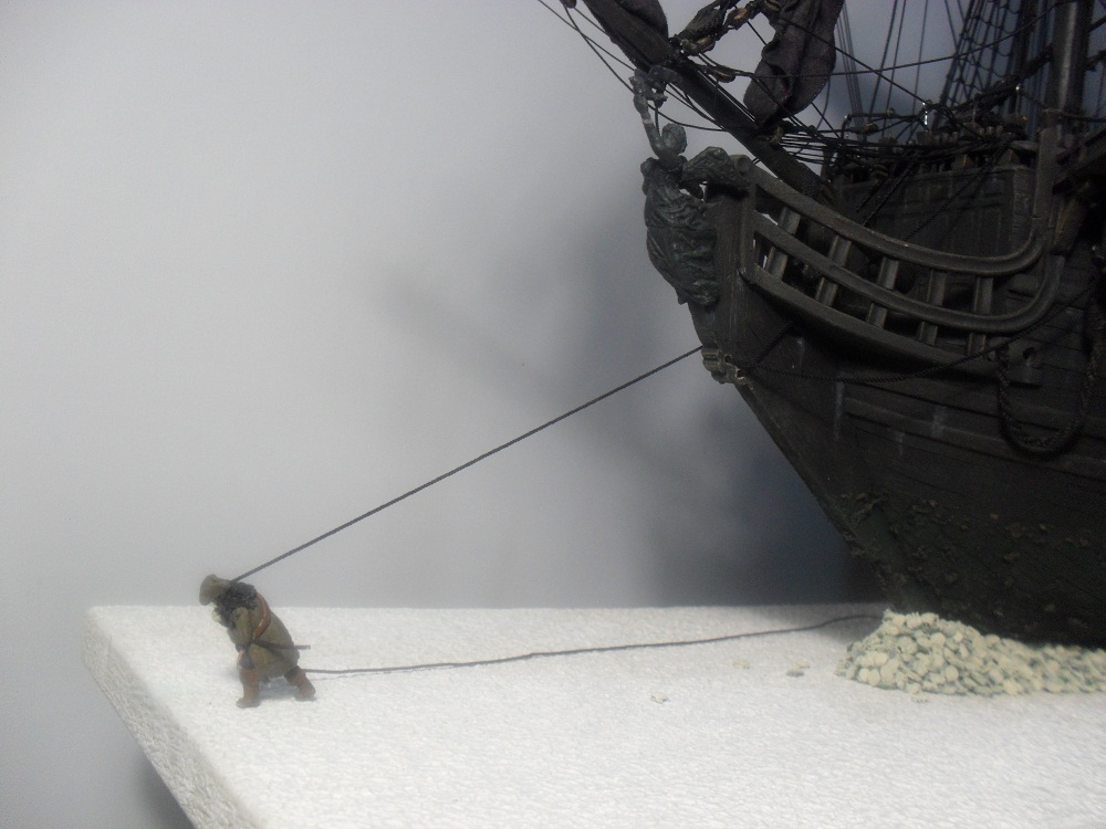 ). Образ вроде узнаваем. И еще поставил мачт-тали на стеньги (только сейчас вспомнил, что ставил шкентели на топы стеньг, а сами тали оставил "на потом" ). И поставил флаг-фал (или фал флага). И повторюсь с вопросом о флаге: как его показать при "полусобранных" парусах, нужно ли его вообще показывать. В принципе, Джек мог поднять флаг, перед тем как тянуть корабль