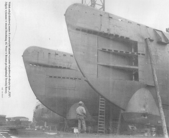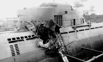 Если верить зарубежным источникам, подводные фотографии запечатлели останки U-2511 - на фотографии с множеством субмарин она третья от пирса..