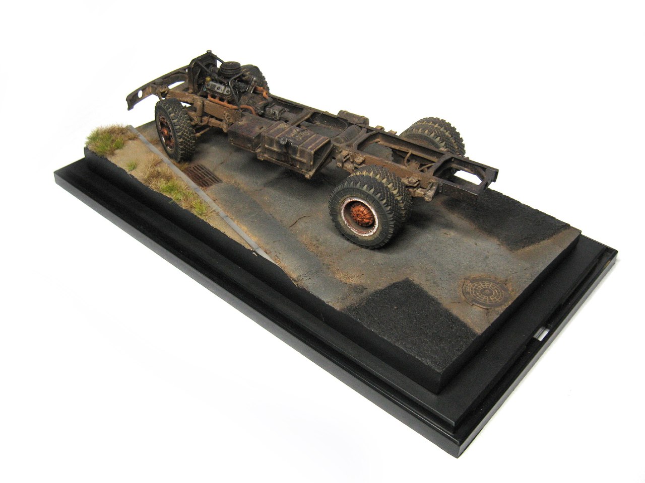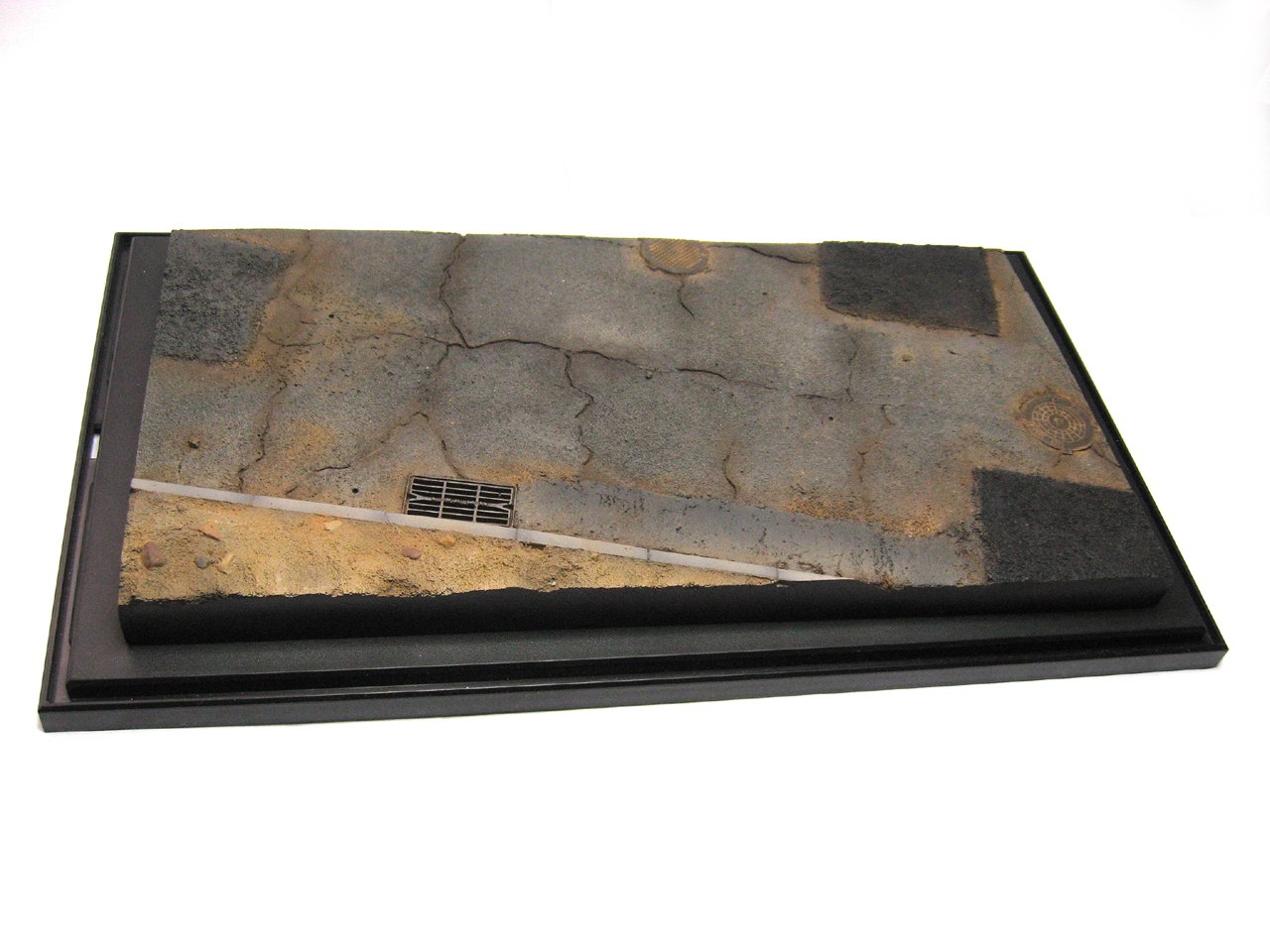 Навалилась работа, так что не продохнуть, но все таки я смог за это время сделать подставку. В основе подставки другая, от диорамы "Воскрешение" с пневмокатком, благо на диораме она завалена листвой и хламом, но у нее один угол срезан. Поэтому пришлось его заменить бордюром, добавить пару заплаток, скрывающих выбоины и ломаный край асфальта. Про изготовление оригинальной подставки здесь http://karopka.ru/forum/forum193/topic17653/?PAGEN_1=7