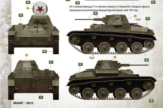 Вариант окраски хочу взять из инструкции. Это машина из 64-й таноковой бригады 21-го танкового корпуса 6-й армии Юго-Западного фронта, принимавшая участие в Харьковской наступательной операции в мае 1942-го года. Фото этой машины я, к сожалению, не нашёл. Если кто богат, буду признателен.