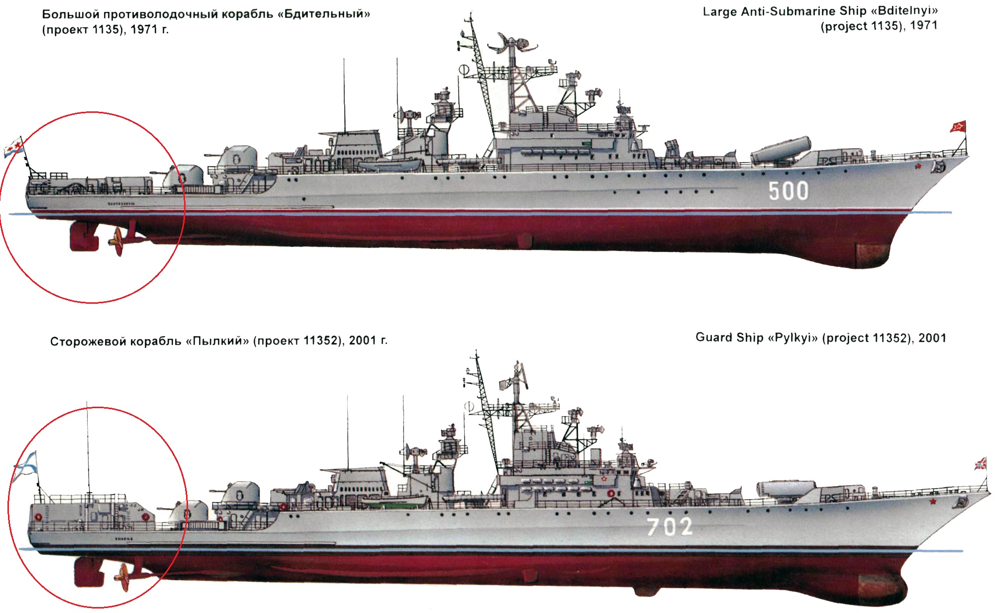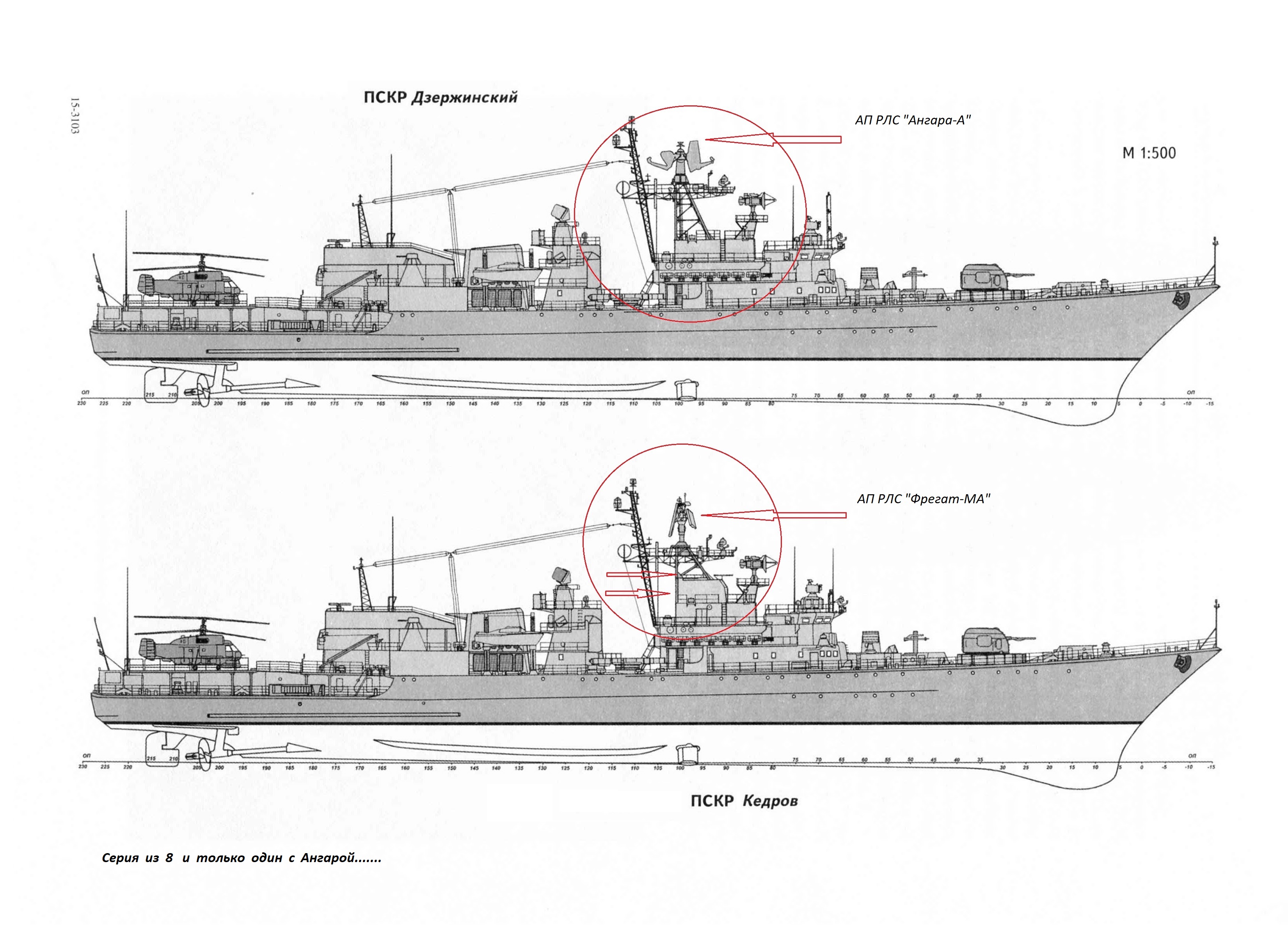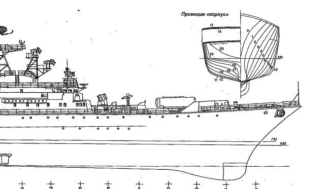 Уважаемый Борис, есть сомнения. Поменять "метель" на арт. систему не просто. Объемы как самой установки и систем для ее применения различен. Согласен что от носа до окончания дымового эшелона надстройки очень похожи, а дальше... ангар не маленький, помещение лебедки БУ (буксирующее устройство» и ГАК "Бронза" (гидроакустические комплексы , Гидроакустическая антенна ГАС «Бронза».) по размерам длины высоты помещений намного больше. Не имею информации что стояло на пылком после большого ремонта, если "Бронза" то тогда вопрос снят.