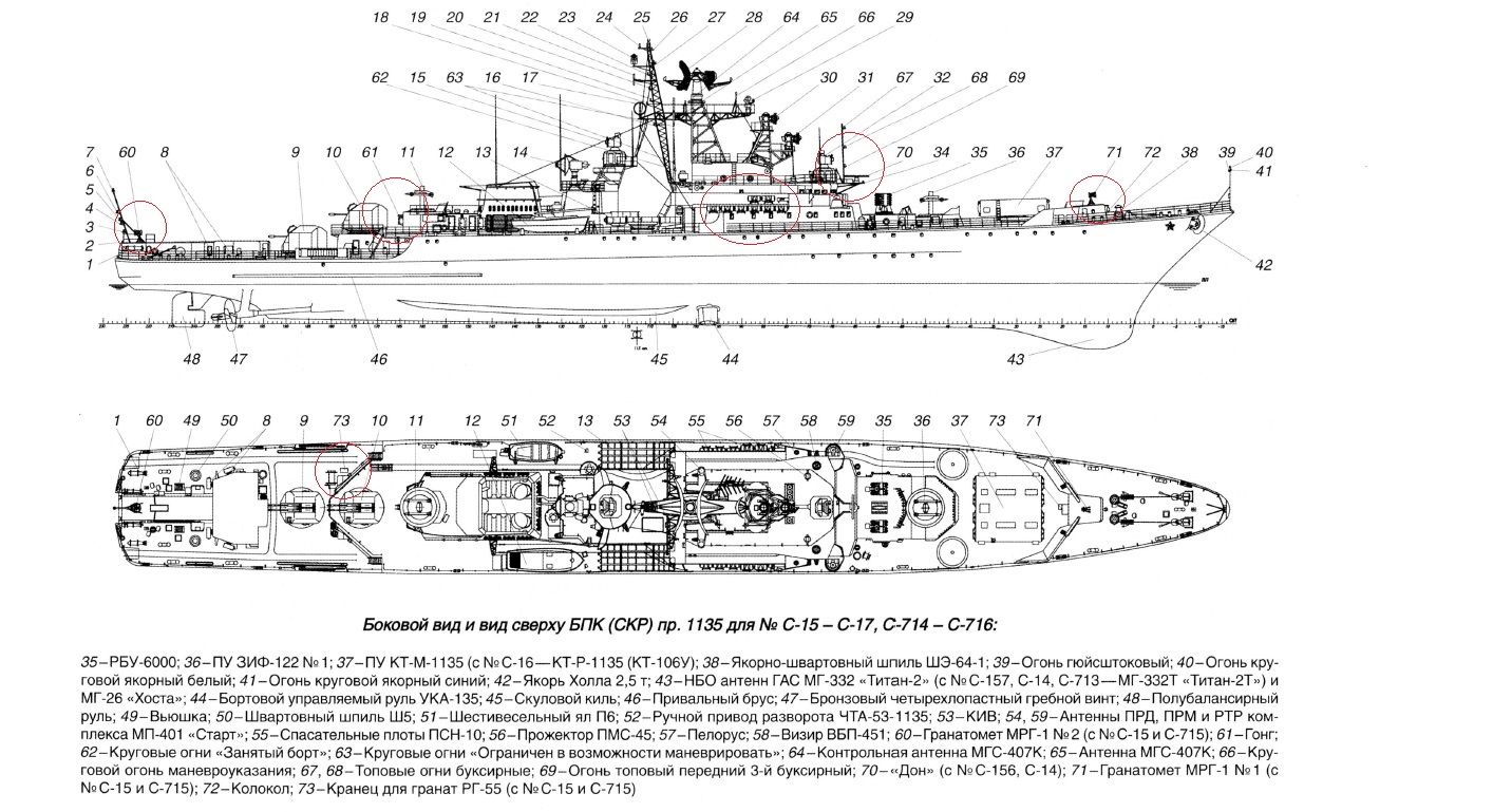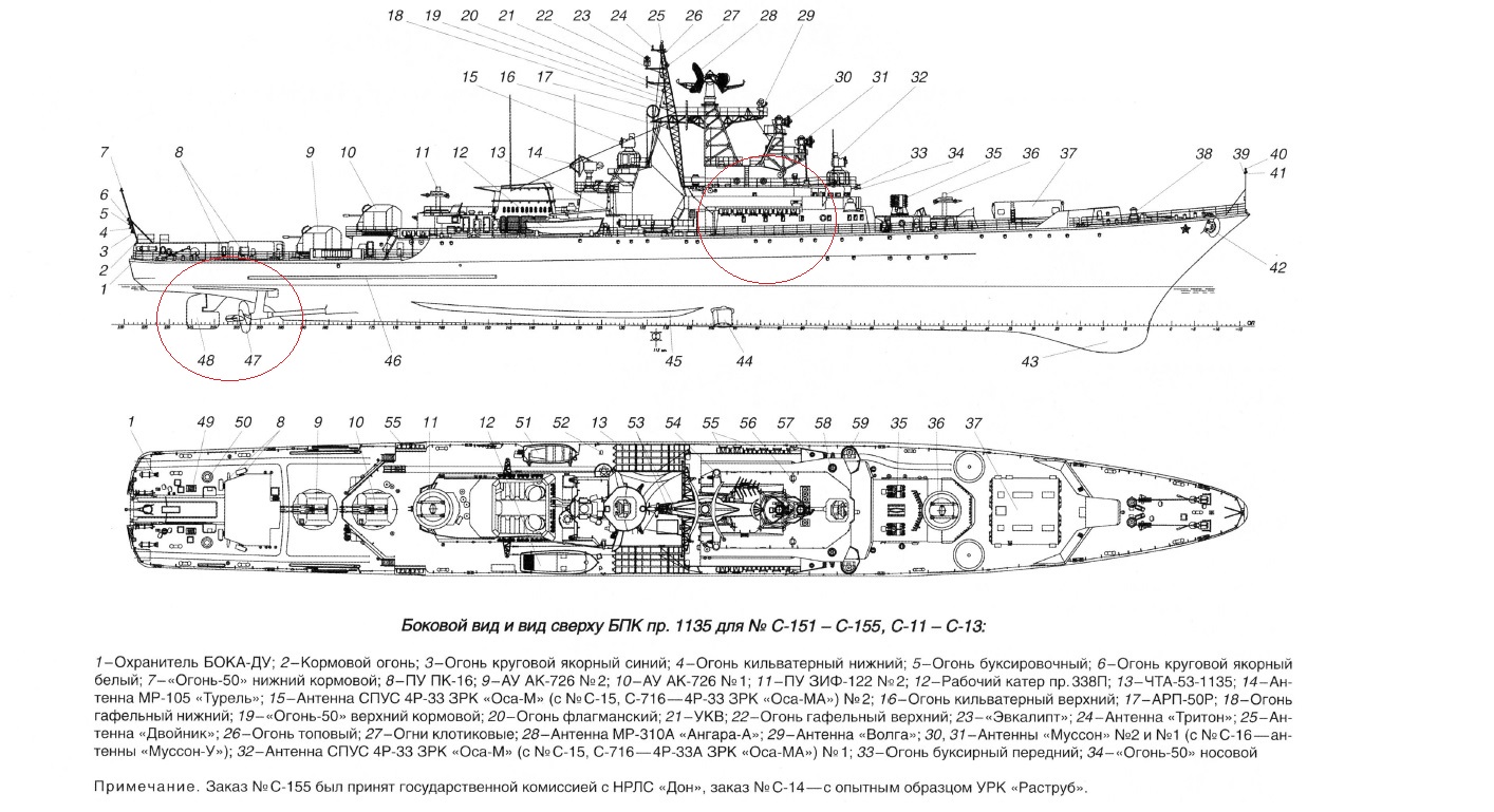 На чистых 1135 и 1135м никаких выступов /бородавок/ не было.На обтекателях винтов стоял "крест". Но это для четырехлопастных. На пяти не знаю. На юте только замечал изменения в надстройке ГАС и в уступе под орудия.А на погранце все это спрятано под полетную палубу.Модели в 1/350 никто не выпускает.А спрос по-моему был бы хороший. Про 1/700 врать не буду.