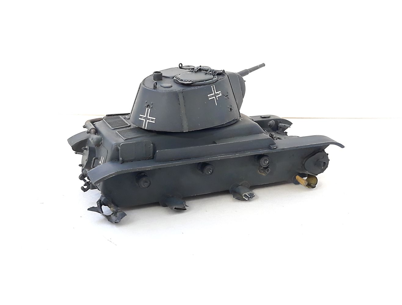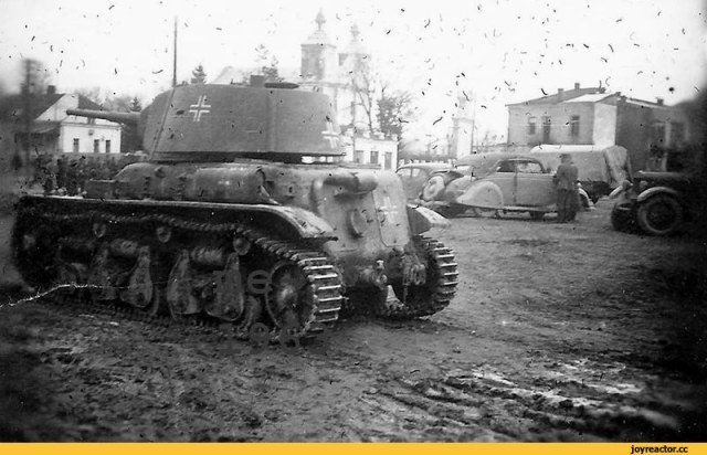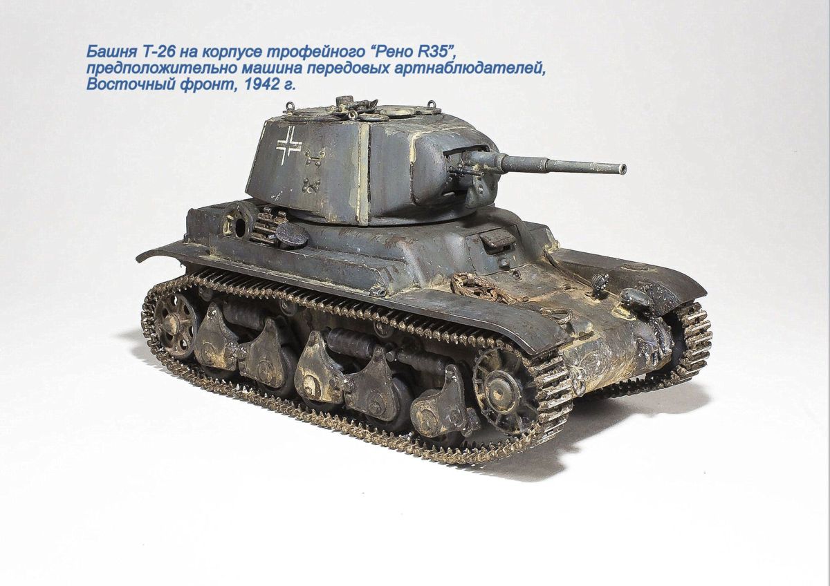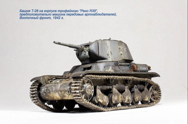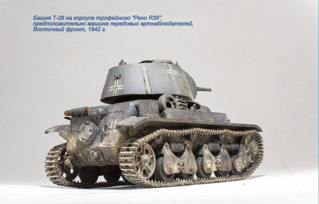 Присоединяюсь к конкурсу со стройкой настоящей "крякозябры" - мутанта из трофейного французского "Рено" и конической башни Т-26. Имеется одна фотография подобного чуда, да фото такого же мутанта, только с цилиндрической башней Т-26. Споры о том, фотожабы это или нет, не утихают до сих пор... Хотя какая-то логика в этих машинах есть - трофейные "Рено" часто использовались как машины передовых артиллерийских наблюдателей, но вот места в башне было маловато. Так что вполне могли родиться подобные "самоделки", тем более, что вращение башни там не предусматривалось в принципе... Но, формально, фото есть, да и тевтоны были еще те затейники.... Так что пусть будет....