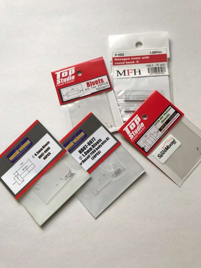 Сначала хотел просверлить отверстия и навставлять винтиков, но в наборе от Top Studio присутствуют отличная имитация головок болтов разных размеров. Их и использовал.