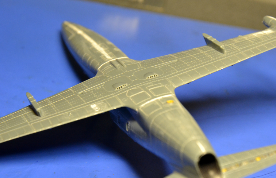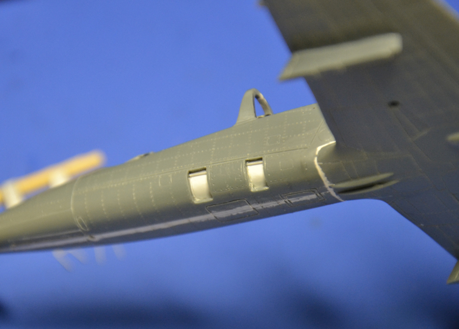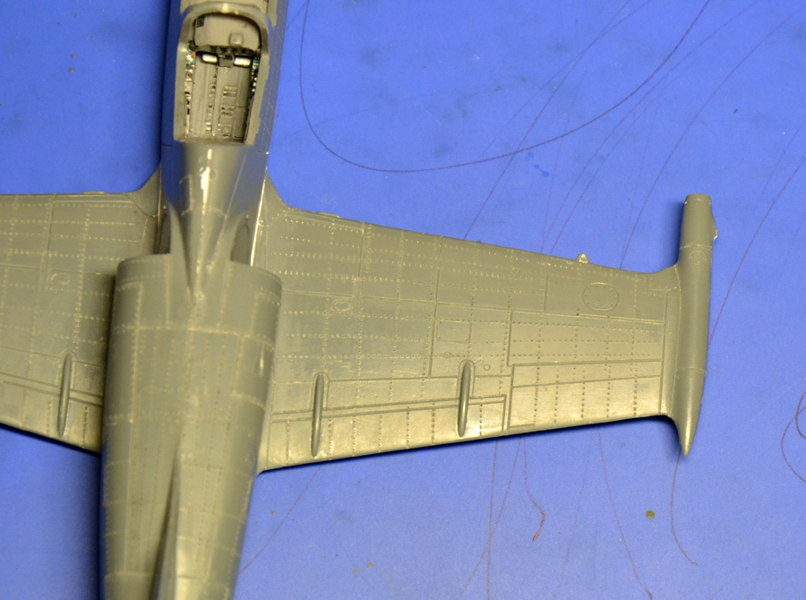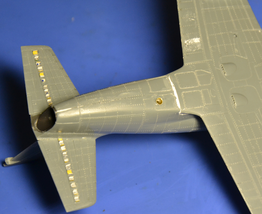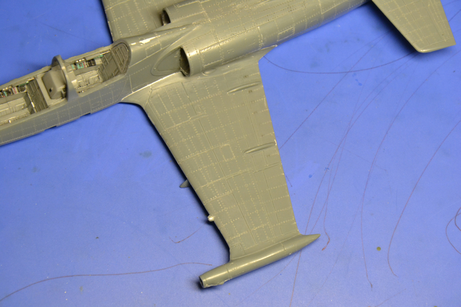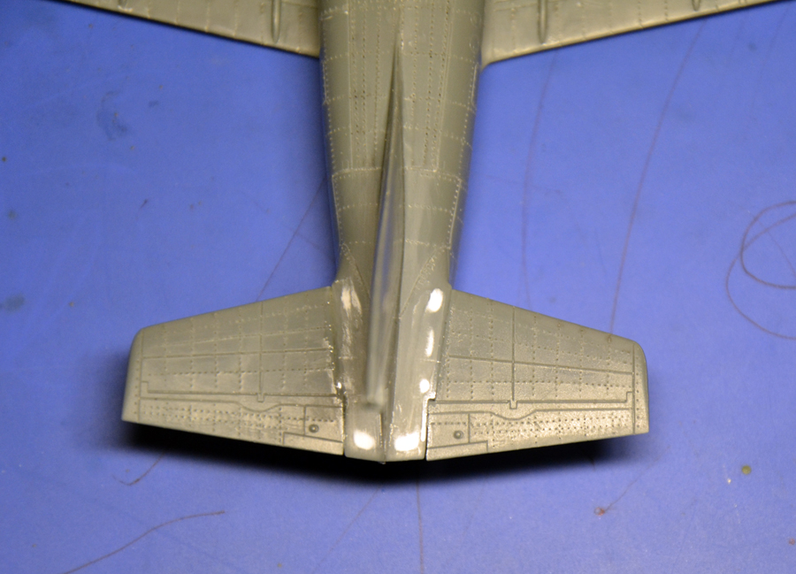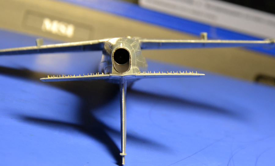 Снизу модель также была немного доработана. А именно - срезал и сточил нафиг те невнятные генераторы вихрей на стабилизаторах, которые дал производитель. Были вырезаны с пивалюминия и наклеены на суперклей