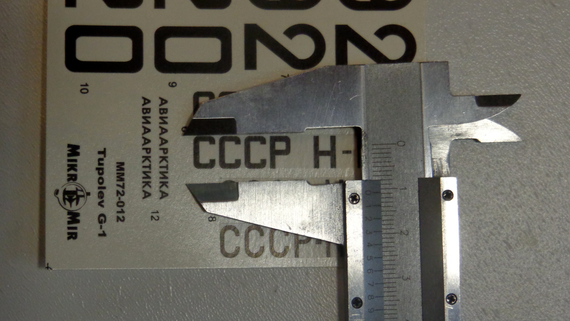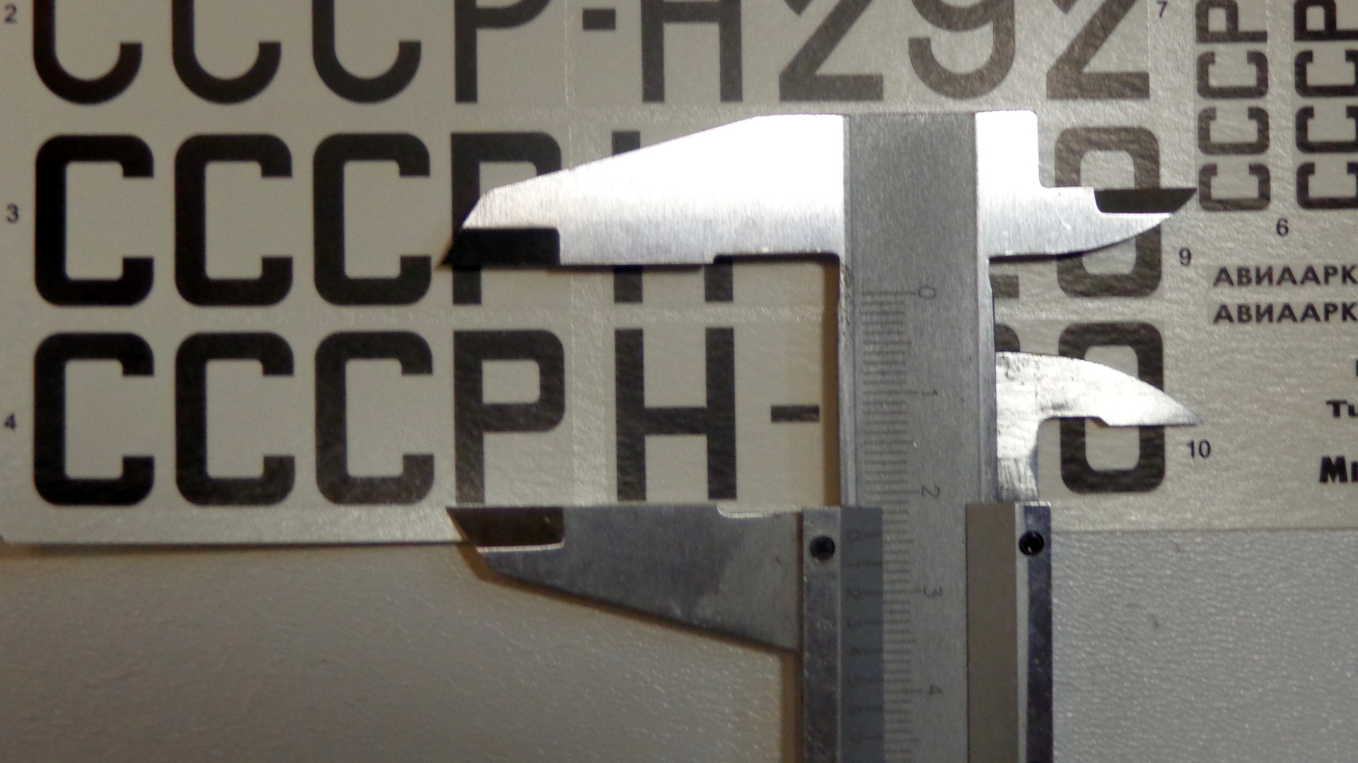 Но ... Если посмотреть чуть внимательней, так сказать перейти в нужный масштаб, то получается вот какая картина. На штанген-циркуле я выставил те размеры регистрационных номеров, которые должны бы были быть на крыльях и бортах на самом деле. То есть получается размер декали уменьшен процентов на 40.