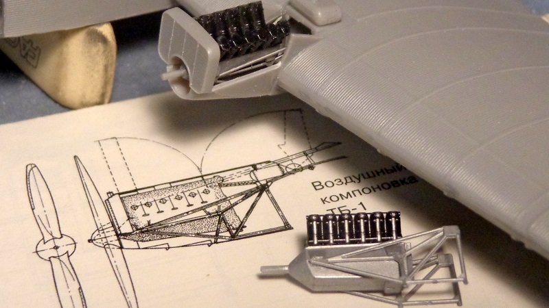 Пригодились моторчики от "Страны Советов", правда нужен то только один. Отрезал от капотов боковые створки, сделаю их снятыми (хотя ещё пока не знаю, они снимались вообще? или опускались может на петлях?) Может кто в курсе на счет капотов ТБ-1? А делать боковушки закрытыми, тогда у двигателя будет видно только верх "горшков" и выхлопные коллекторы, моторама скроется.