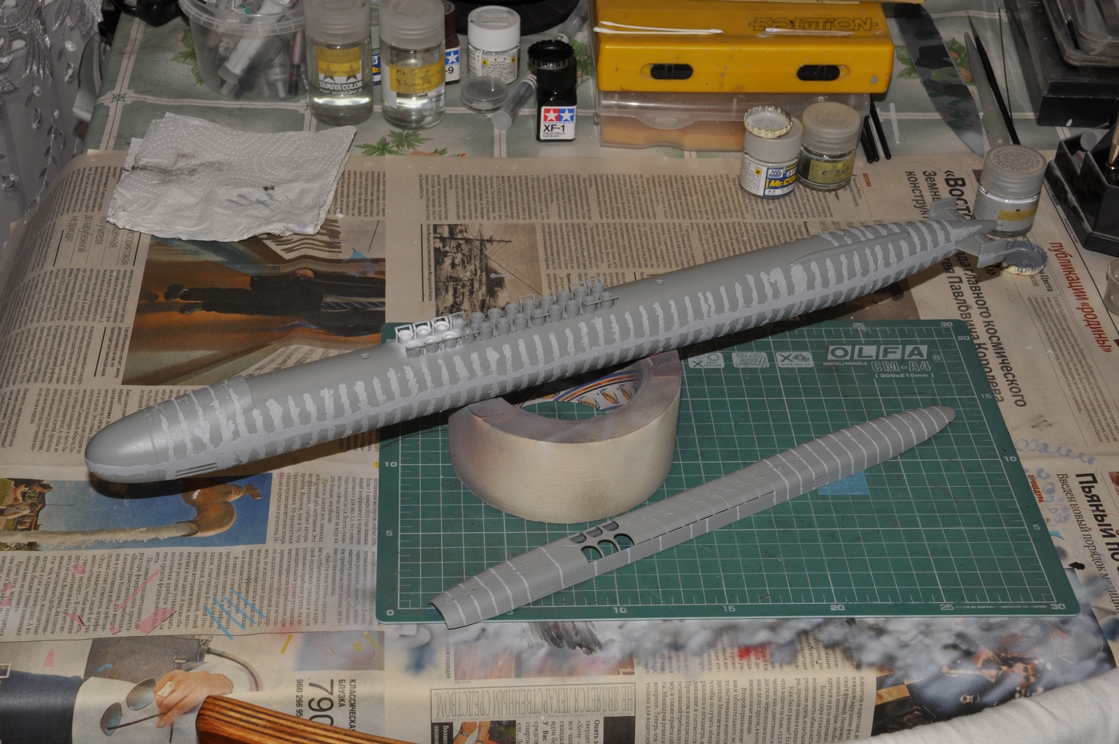 Процесс шпаклевания расшивки на корпусе не быстрый, но в результате имеем вот такую зебру: