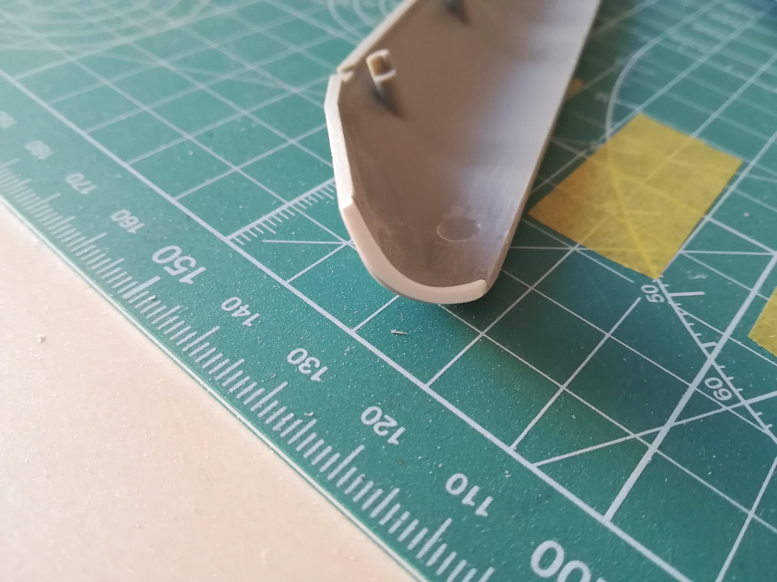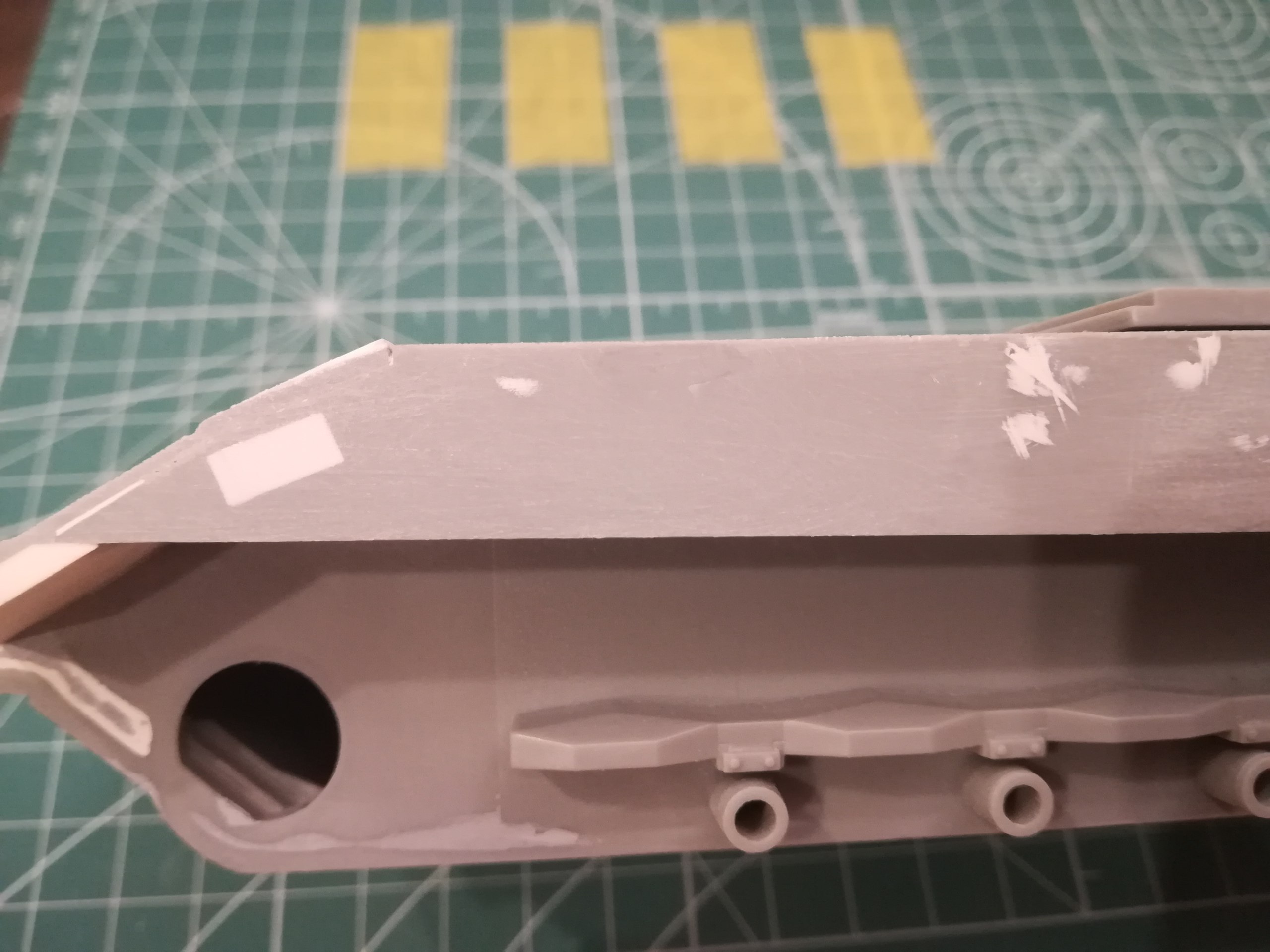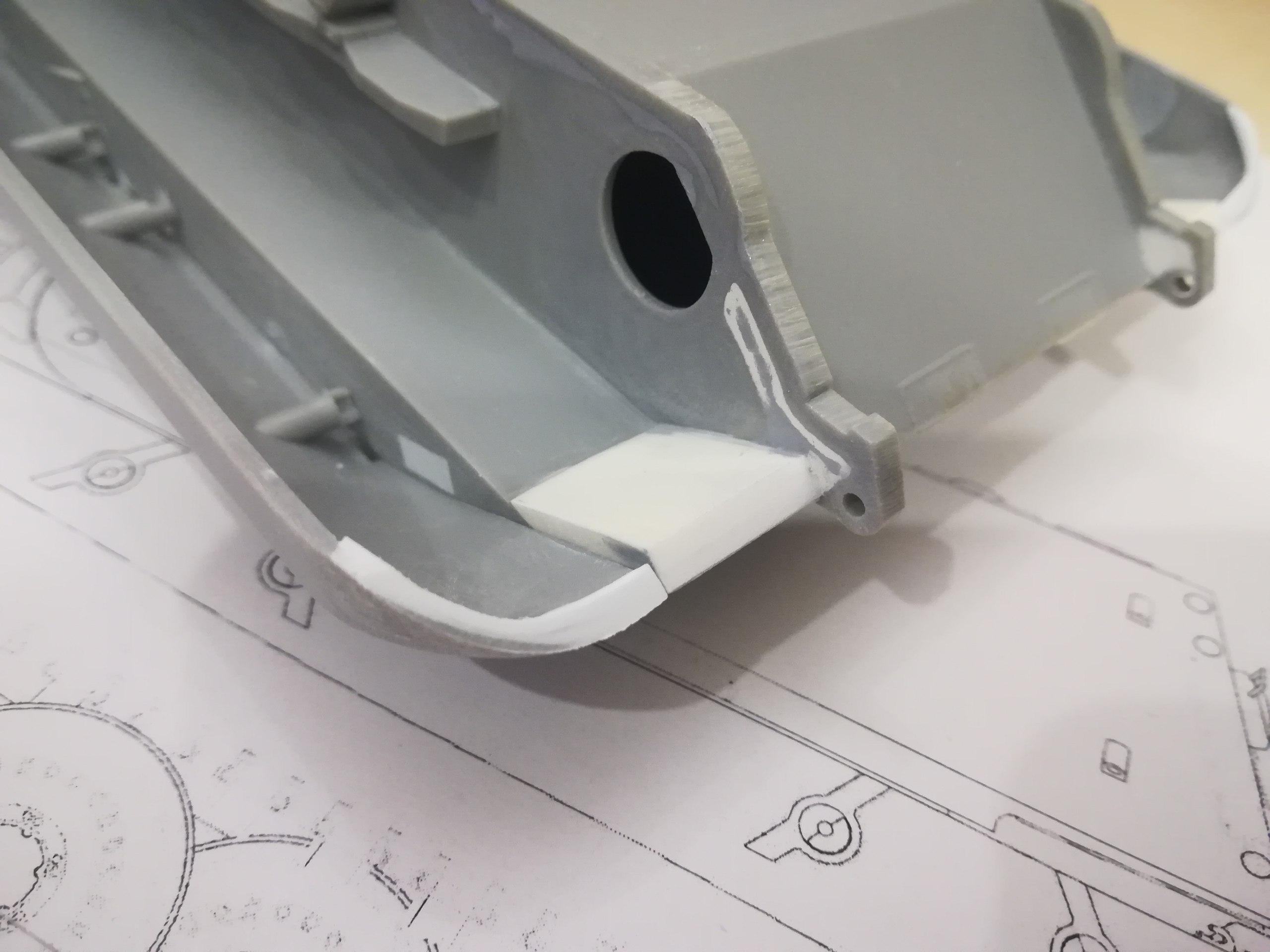 И как раз немного пробежимся по экранам. Пока пытаюсь вывести торец переднего экрана. Драгон его отлил заваленным аж до горизонтали. А он, торец, должен повторять угол нижней бронеплиты. Как всегда Эвергриновскими прутками наростил родной пластик, и зашкурил под нужным углом. Пока начерно. Ещё предстоит полепить изнутри шпаклёвкой.