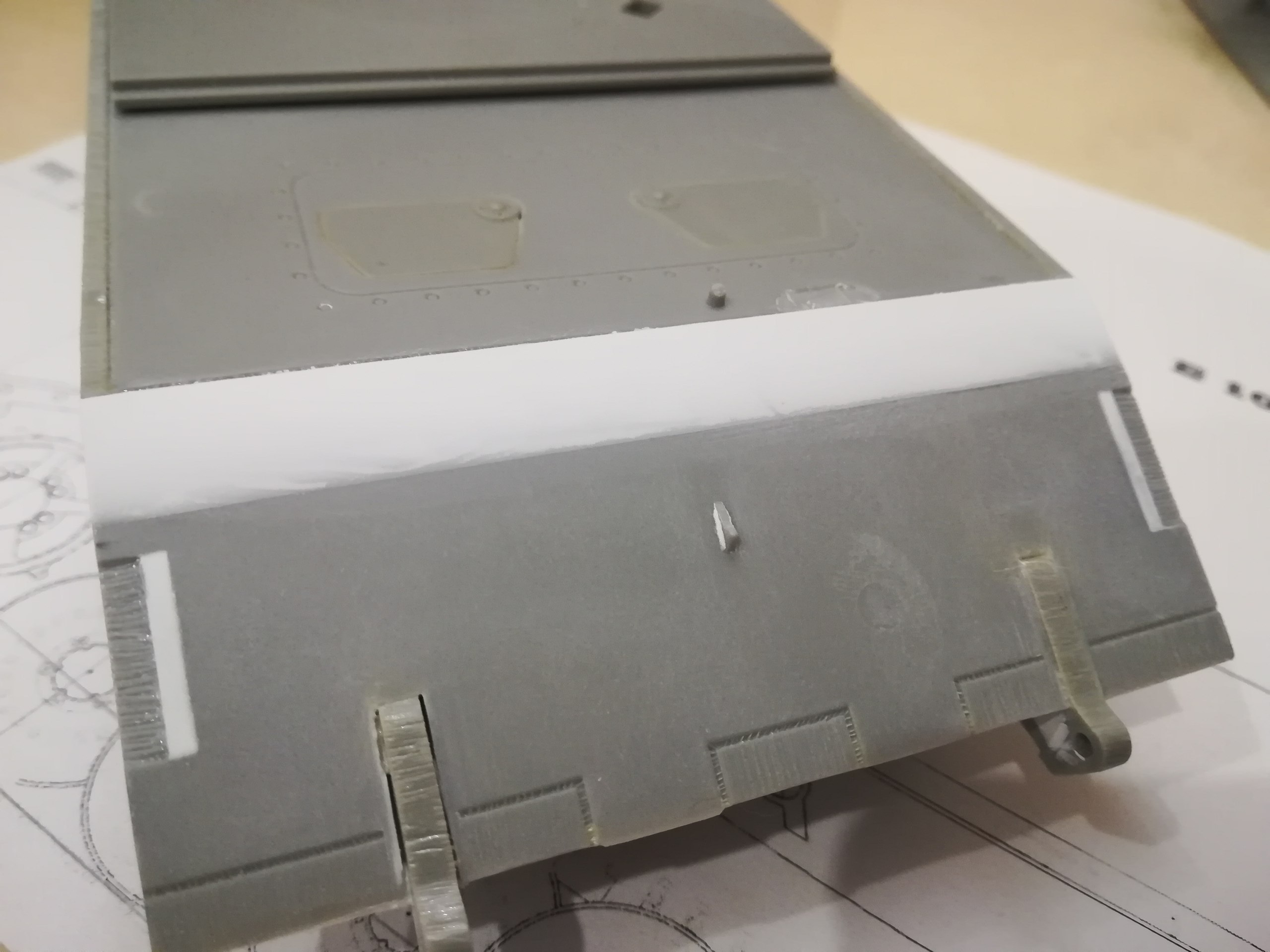 А пока очередной слой пластика на экранах просыхает на полотенцесушителе, шиповое соединение верхней лобовой бронеплиты с бортовой переезжает на новое место, к краю бронелиста, и принимает масштабную толщину. Так же имитируются следы газорезки. В передней части бортового бронелиста заделал шиповое соединение, изображённое производителем так же не на месте. Позже перенесу его, подобно верхнему шипу, на верное место.
