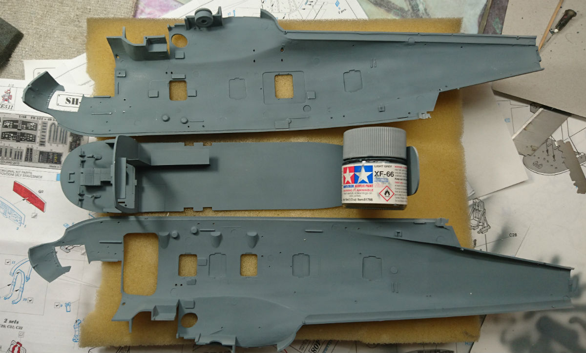 Задул внутрянку светло-серым тамиевским акрилом. Была мысля изобразить шпангоуты и нервюры, а там ещё и проводка подтянется, такой суслик получится, очень жирный))). Пока думал, рука сама потянулась за аэрографом)))
