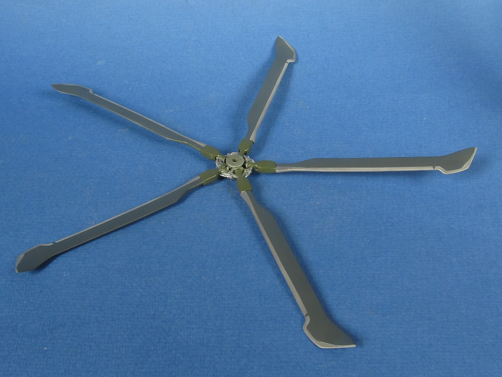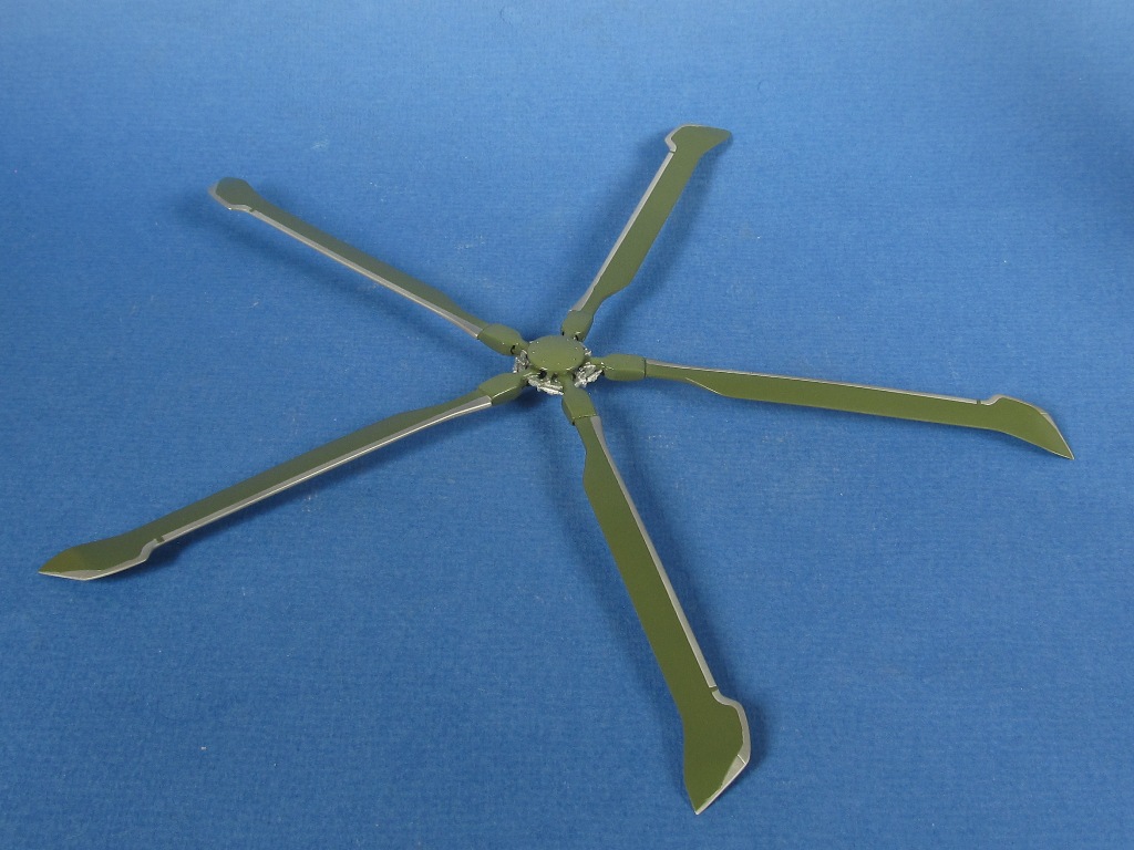 Окраску начал с несущего винта. Снизу окрасил в Нато-блэк от Тамии, сверху в Грин-форрест (кажется) от АК Реал-колор. С этой краской впервые работал, понравилась. Но в банке очень густая, нужно здорово разводить. Но зато её надолго хватит