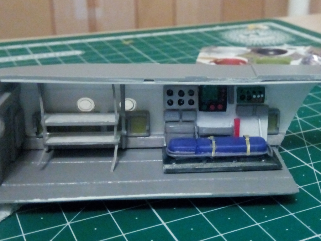 Как удалось выяснить, в момент презентации, машина таки была оборудована медецинско-спасательной техникой, а так же местами для тяжелых (лежачих) спасаемых. Все это и попробую изобразить. Конечно это отчасти суслики, но задние сворки будут открытыми, поэтому будет видно... Пока работаю с левым бортом. Сделана обшивка, сиденья в сложенном положении, ну и первая стойка (частично) с местами для лежачих пациентов. Примерка, пока насухо, впереди еще обработка.