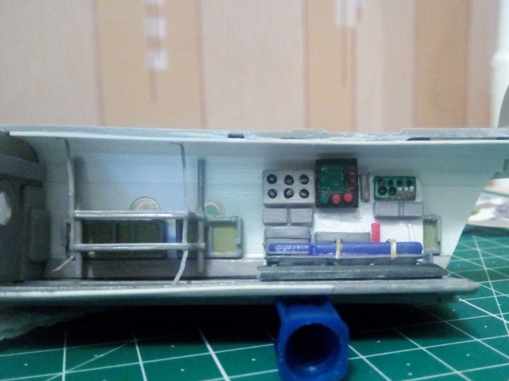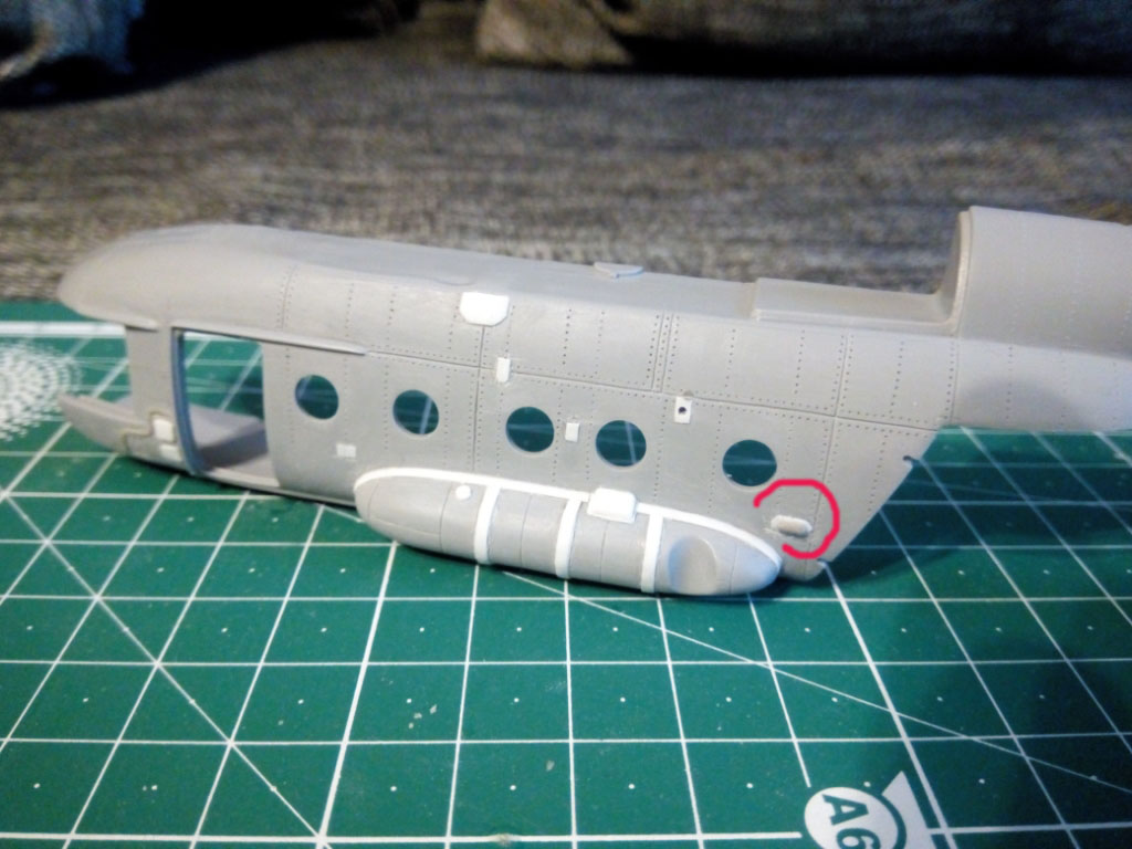 За пилотской перегородкой (шпангоут №5) с правой стороны, на всех МИ-8Т (и любых его модификациях, кроме МТ, МТВ. АМТ) стоит оригинальный короб, в котором расположены ещё 2 аккумулятора (из 6 положенных). У Вас, он как-то странно выглядит, учитывая что он на самом видном месте, если еще и дверь будет открыта. Кстати. У Звезды, эта деталь идет в наборе.