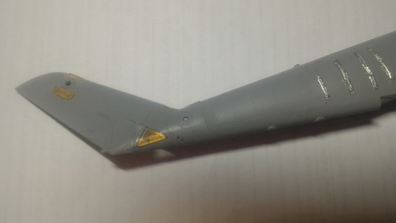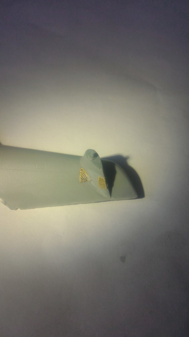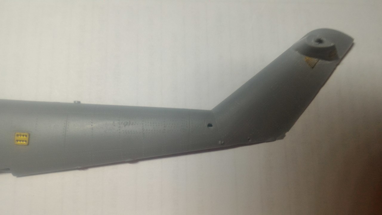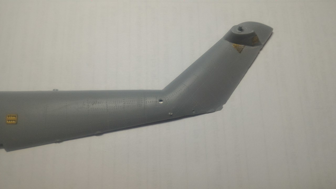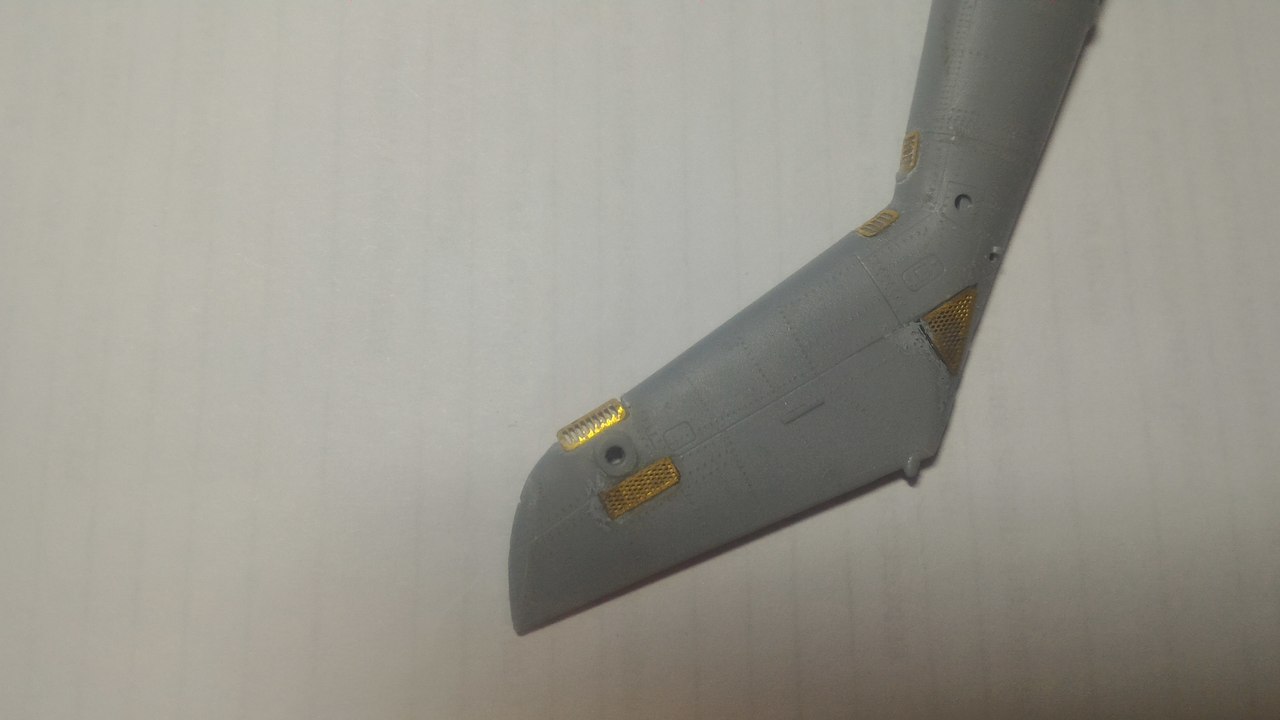 Теперь, по процессу постройки...На данный момент времени имеется- добавлены элементы экстерьера: жаропрочная накладка вокруг выхлопного отверстия двигателя, и кронштейны нижнего шарнирного крепления стоек ЭВУ. Проделаны отверстия в хвостовой балке и добавлены патрубки выхлопа ВСУ и различные воздухозаборники. Сетки вентиляции привода РВ заменены на травленые.