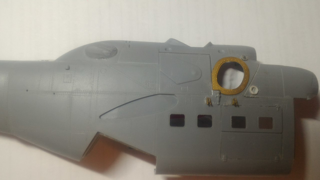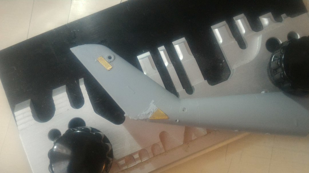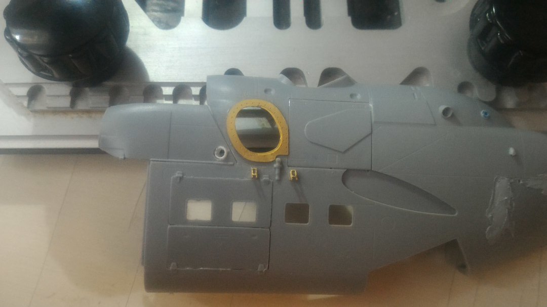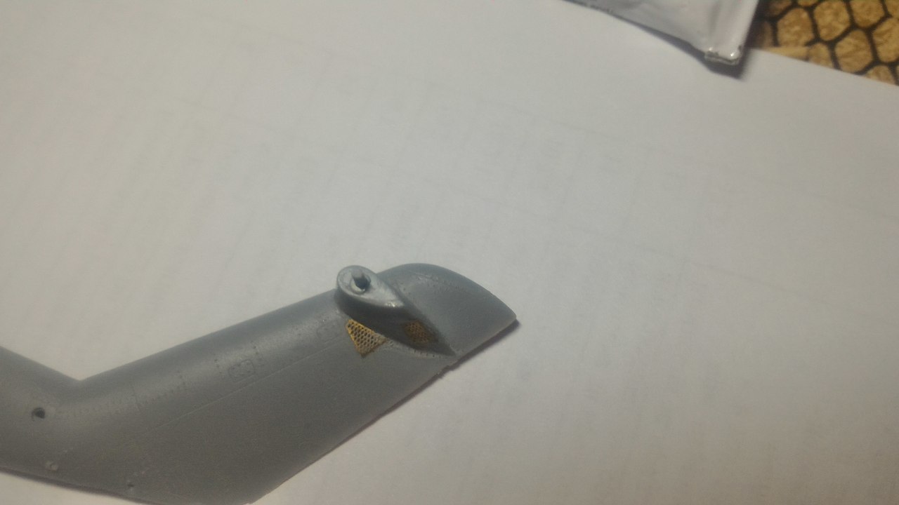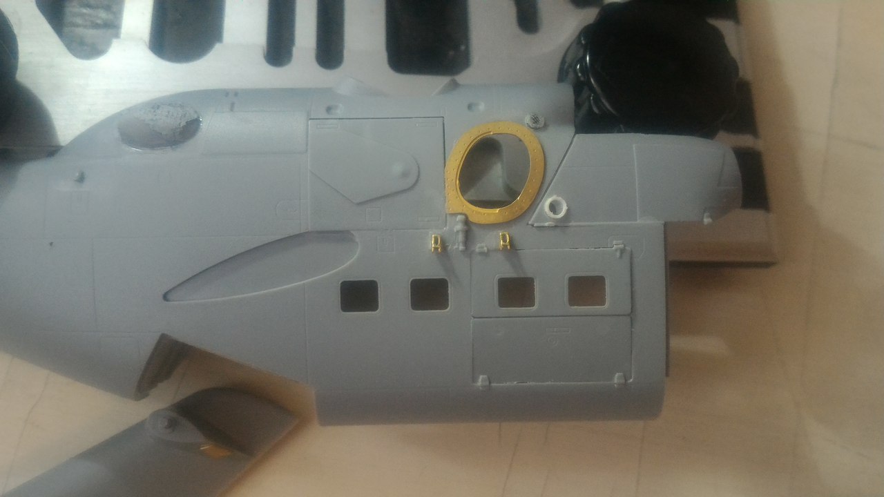 Теперь, по процессу постройки...На данный момент времени имеется- добавлены элементы экстерьера: жаропрочная накладка вокруг выхлопного отверстия двигателя, и кронштейны нижнего шарнирного крепления стоек ЭВУ. Проделаны отверстия в хвостовой балке и добавлены патрубки выхлопа ВСУ и различные воздухозаборники. Сетки вентиляции привода РВ заменены на травленые.