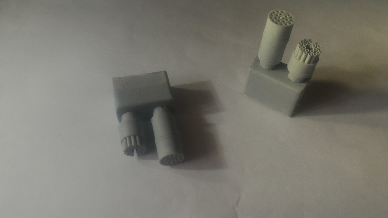 Ну и один из самых интригующих меня вопросов-подвесное вооружение. Известно, что в Афганистане на машины, которые работали в высокогорье, ввиду того, что из-за разреженности воздуха и высокой температуры от жары, мощность двигателя падала, полную загрузку не делали. Имею ввиду четыре блока НАР полностью заряженных и четыре ПТУРа. Однако, я видал фото с двумя блоками Б8В20 и двумя контейнерами УПК-23-250. Тот же вариант предлагает и сама "Звезда". Думается мне, что такое возможно было в случае, если машина выходила работать либо рядом с аэродромом (хоть аэродромы тоже над уровнем моря были высоко) либо в пустынной местности, где не нужно было высоко забираться.. В общем, я думаю, что моя машина будет с такой загрузкой, возможно добавлю по одному ПТУРу.Вот, кстати, собрал на черновую пушечные контейнера и рассверлил стволы ГШ-23Л. Приятную особенность для себя открыл в конкретноом наборе-если при рассверловке стволов УПК сломается один или два из четырёх, можно будет позаимствовать их от подвижной установки для варианта ВП,если конечно нет намерения изготовить именно эту модификацию. И, самый интересный вопрос, к знающим- возможна ли подвеска самолетного Б8М и Б8М1 на вертолёт? Имеется, просто парочка смоляных от "RV Aircraft".Помнится мне, что в какой-то кинохронике видел кадр из десанта крокодила, где они висели на пилонах. Могу ошибаться, может быть я их спутал с УБ-32-ыми. Как раз-таки в сети с УБ-32 фото вагон а с Б8М только одна единственная картинка,даже не фото.. Однако, всё же интересно мнение специалиста.)