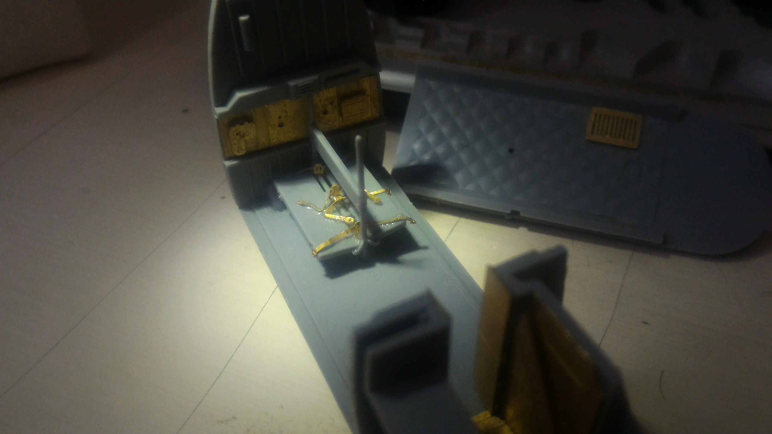 Андрей, неплохо начали. Что сразу бросается в глаза.... Травленные сеточки нужно было слегка "утопить", чтобы они были вровень с поверхностью обшивки фюзеля. И еще, лично мне не нравятся, как вы сделали ремни в десантном отсеке. Лучше их делать самому из более пластичного материала (например, фольги) А от травленных использовать пряжки и замки. Кстати, со спинки тоже должны свисать серые ремни.