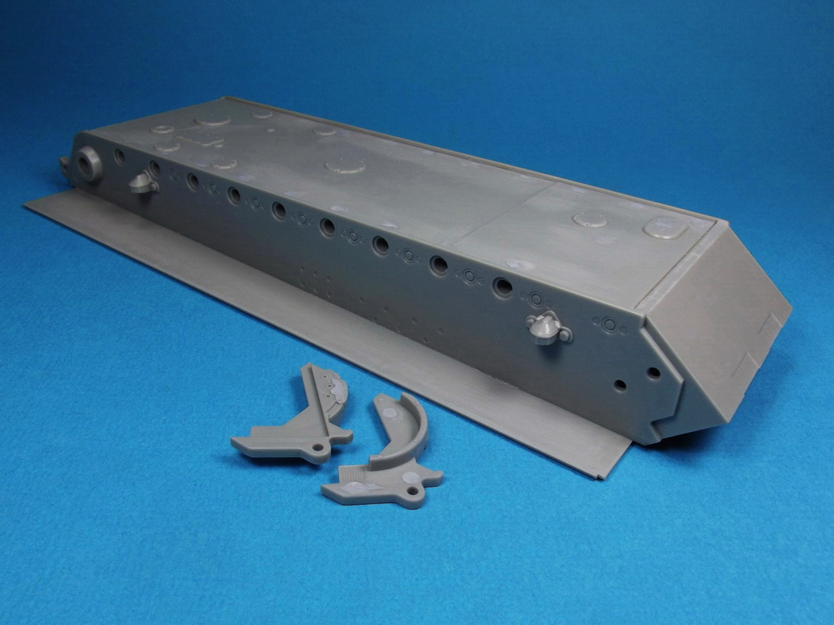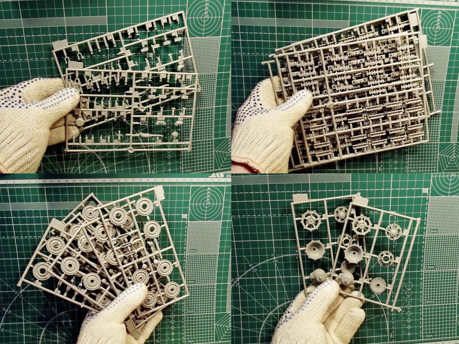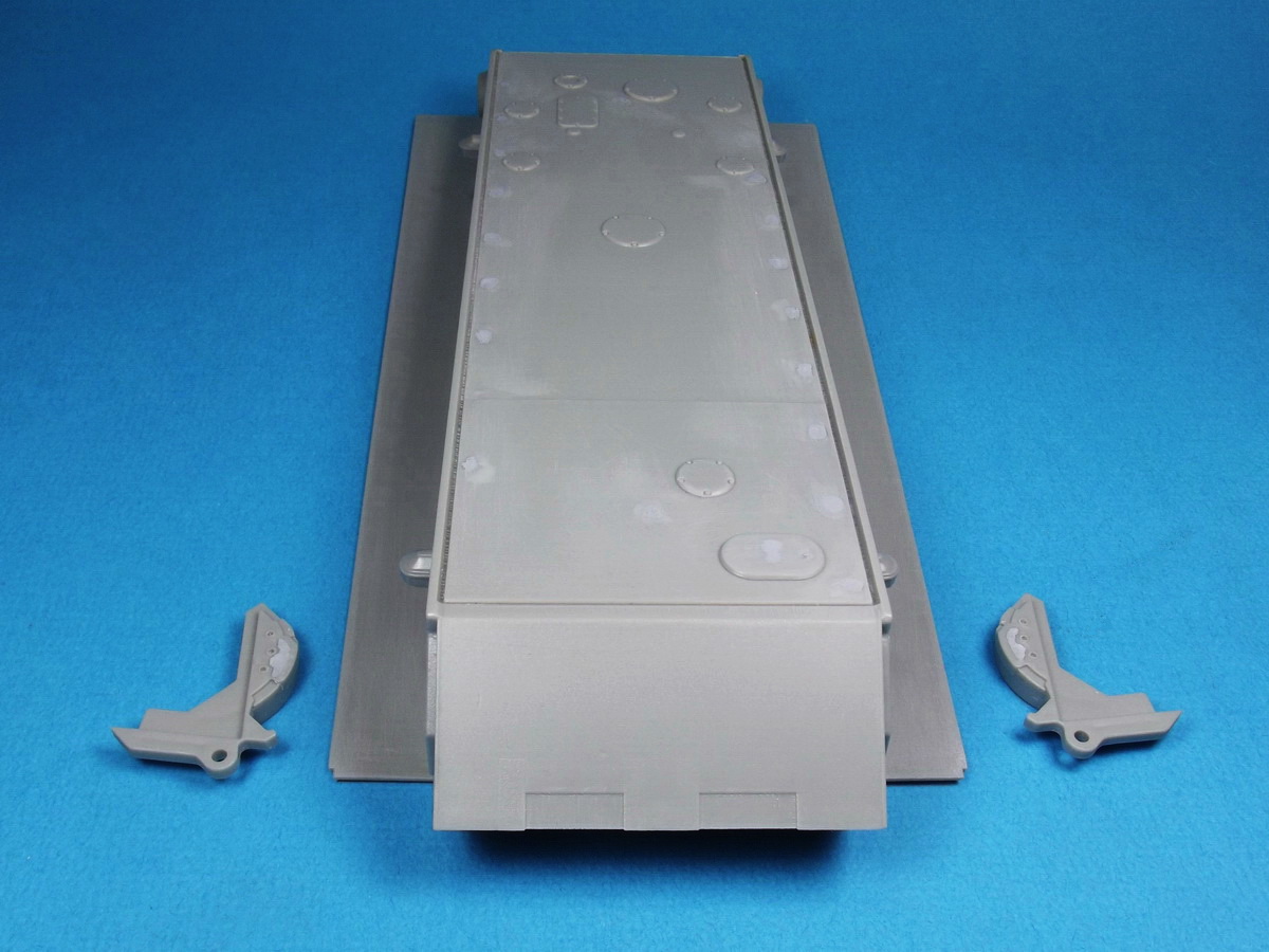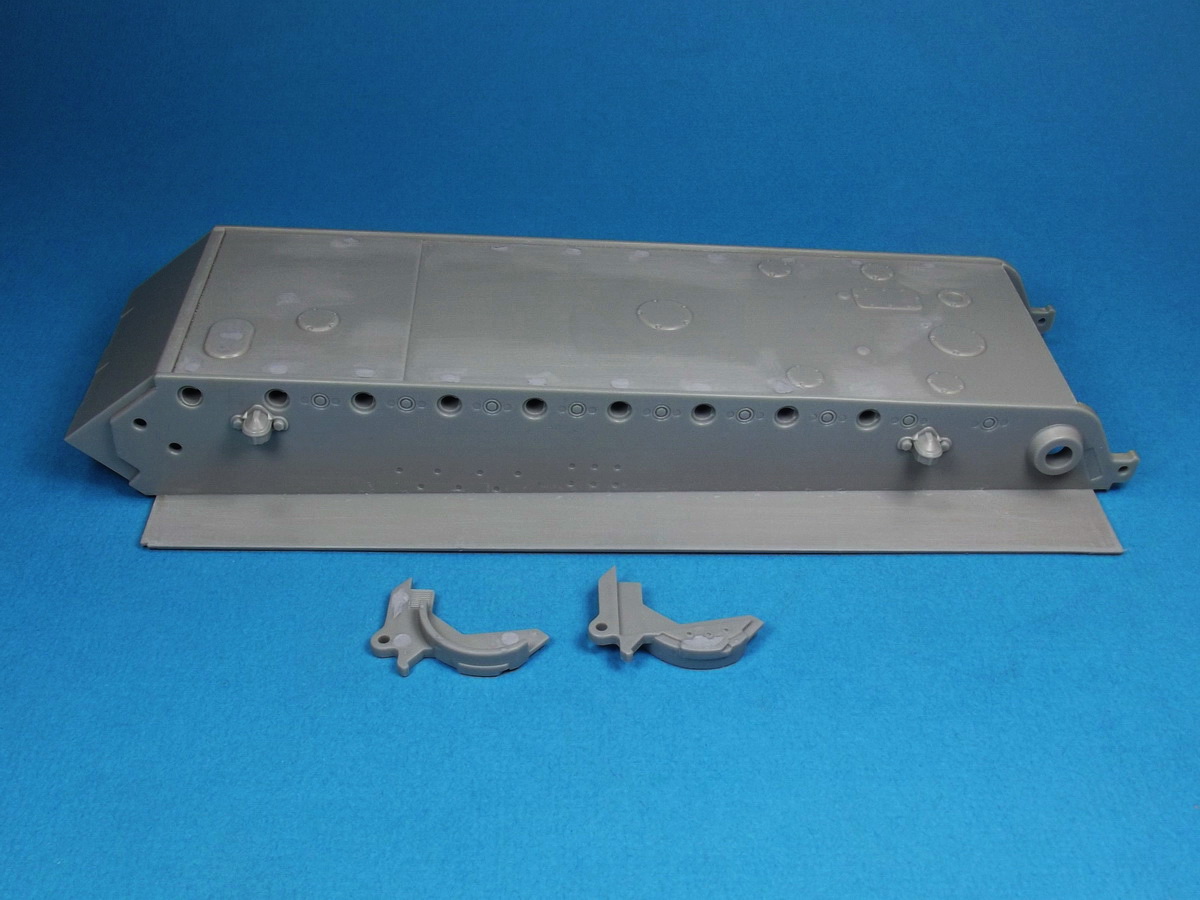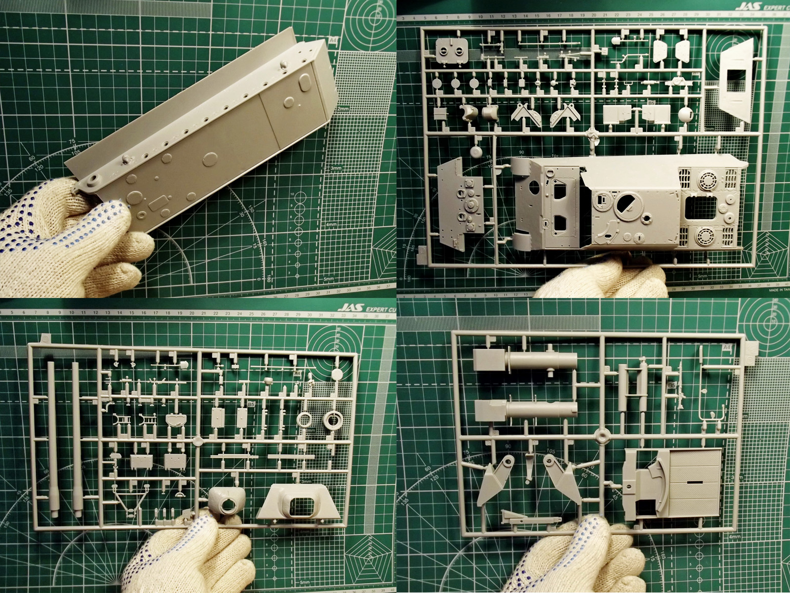 Для того, чтобы по-настоящему втянуться в рабочий ритм, начал с крупных деталей. Это-ванна корпуса и защита ведущих колес, которые клеятся уже отдельно. Все бы хорошо, но, похоже, придется все-таки прикупить ведро шпатлевки. Судя по началу, так тому и быть!