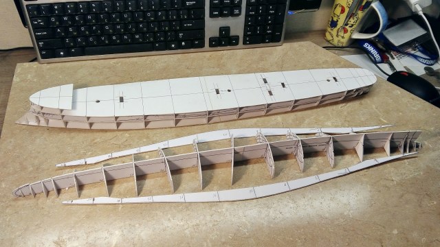 Итак, начало положено. На сегодняшний день собрал каркас по теории корпуса и начал его обшивать. Модель будет в основном клеится из картона и мелованного ватмана. Корпус будет шпаклеваться. Не знаю на сколько затянется стройка. Главная цель публикации сказки - помощь коллег в прояснении некоторых сомнительных вопросов и практическими советами.