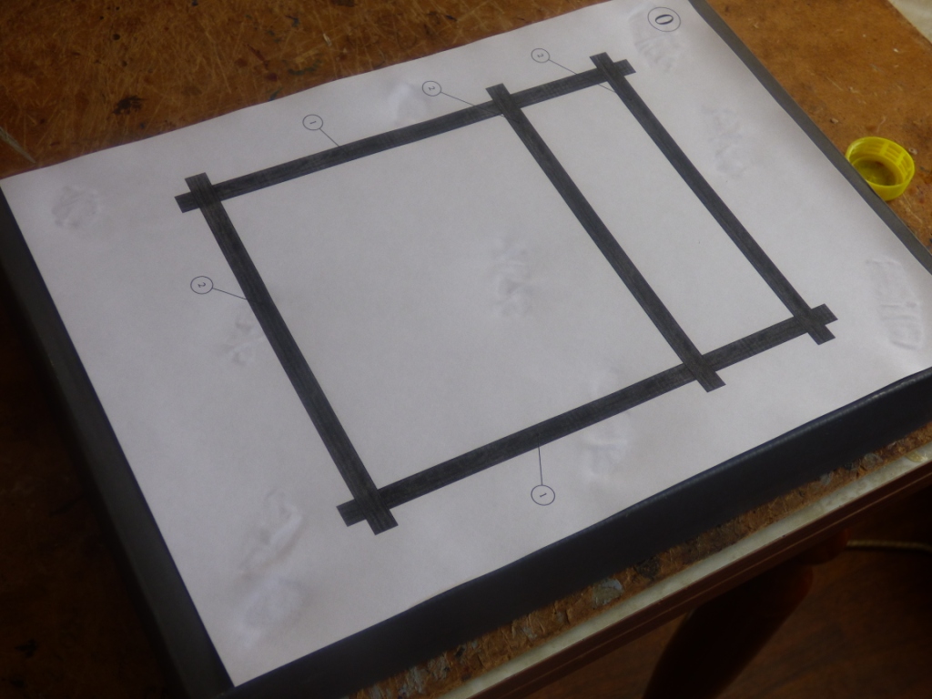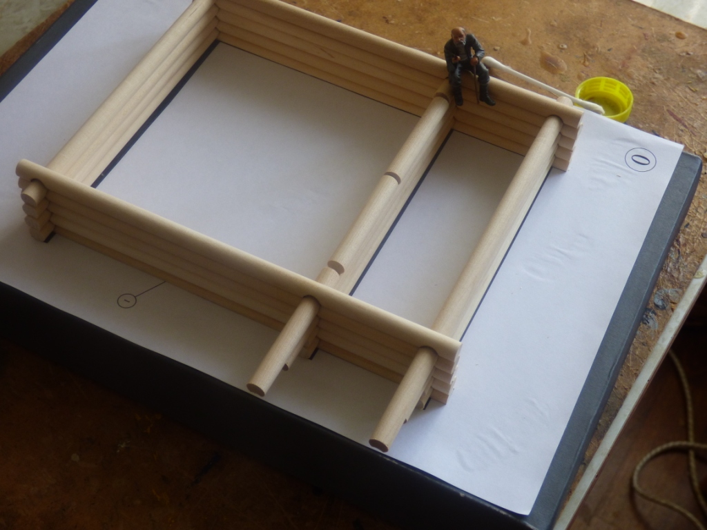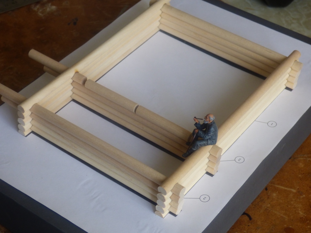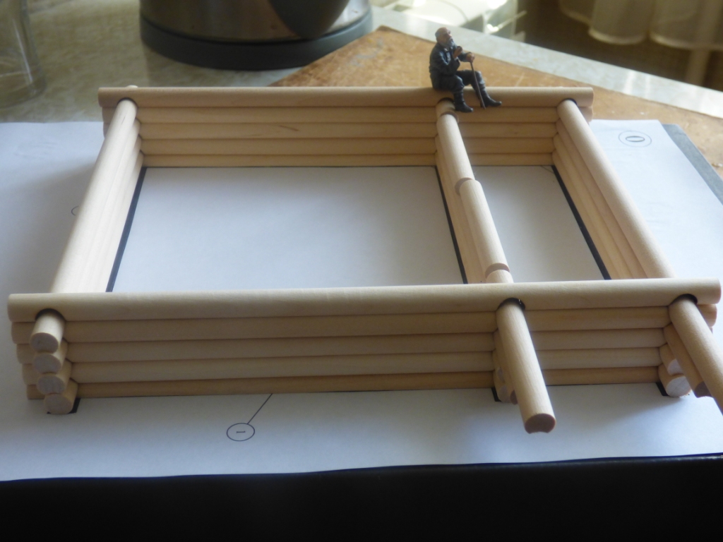 Чтобы четко вывести первый венец приклеил план основания к жесткому картону и по плану выкладывал его