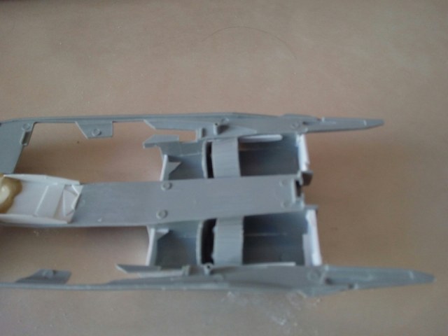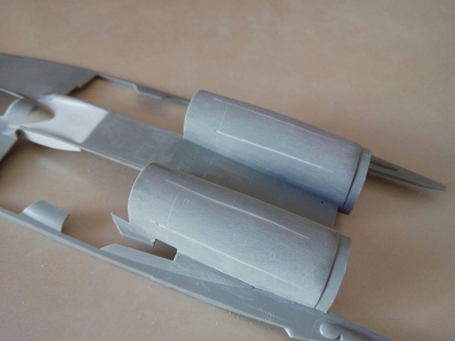 Мотогондолы были разрезаны вдоль в нескольких местах лезвием модельного ножа и в эти щели затыкан пластик от моих любимых бичпакетов. В результате капоты получились более "пузатыми". В оригинальном исполнении они совсем плоские, что не есть хорошо! Так же пластиком исправлено место за нишей передней стойки.