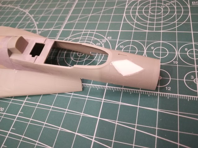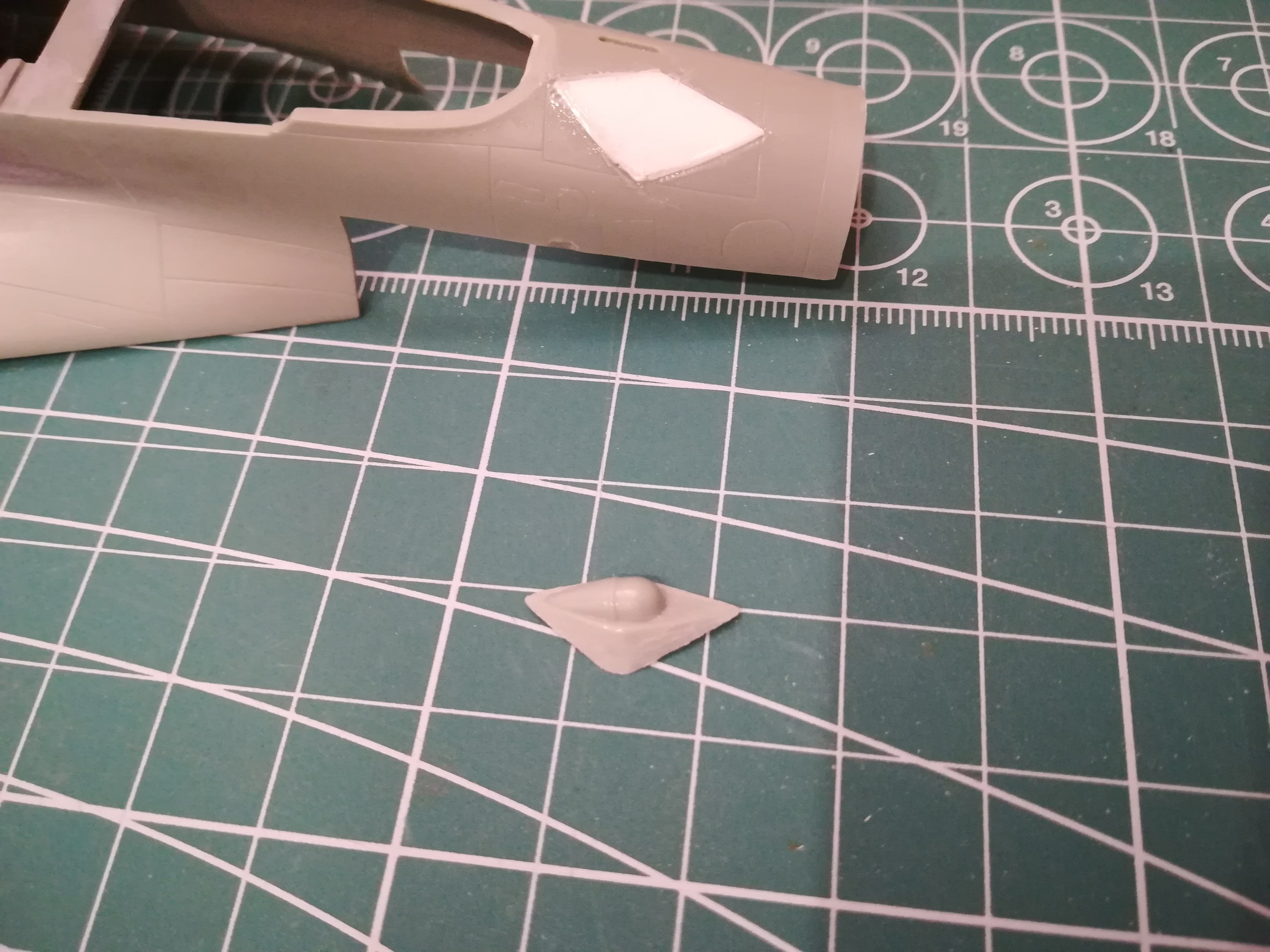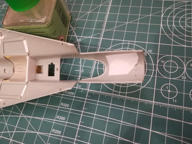 В получившееся отверстие в фюзеляже подгоняю и вклеиваю заплатку из миллиметрового пластика.