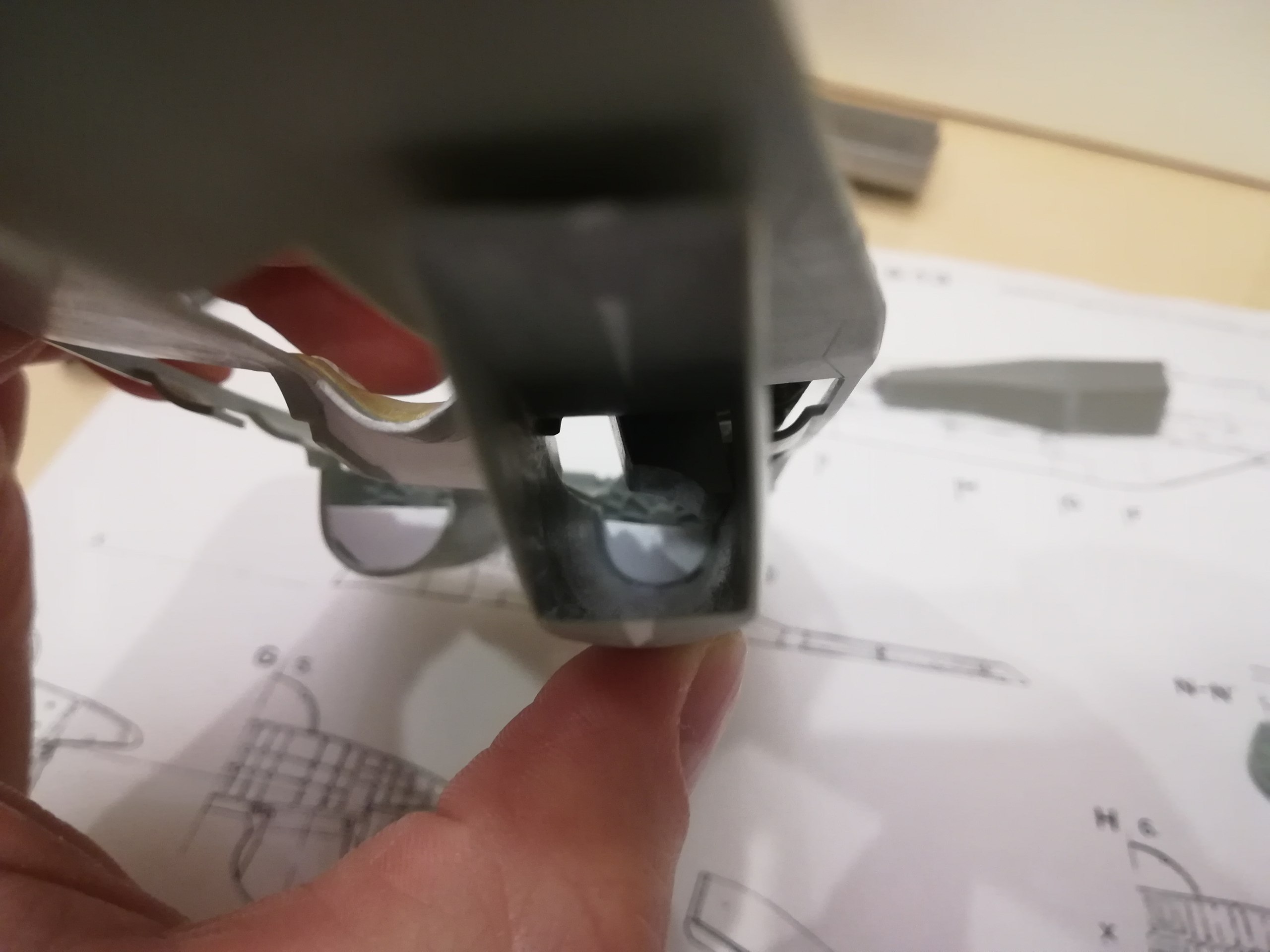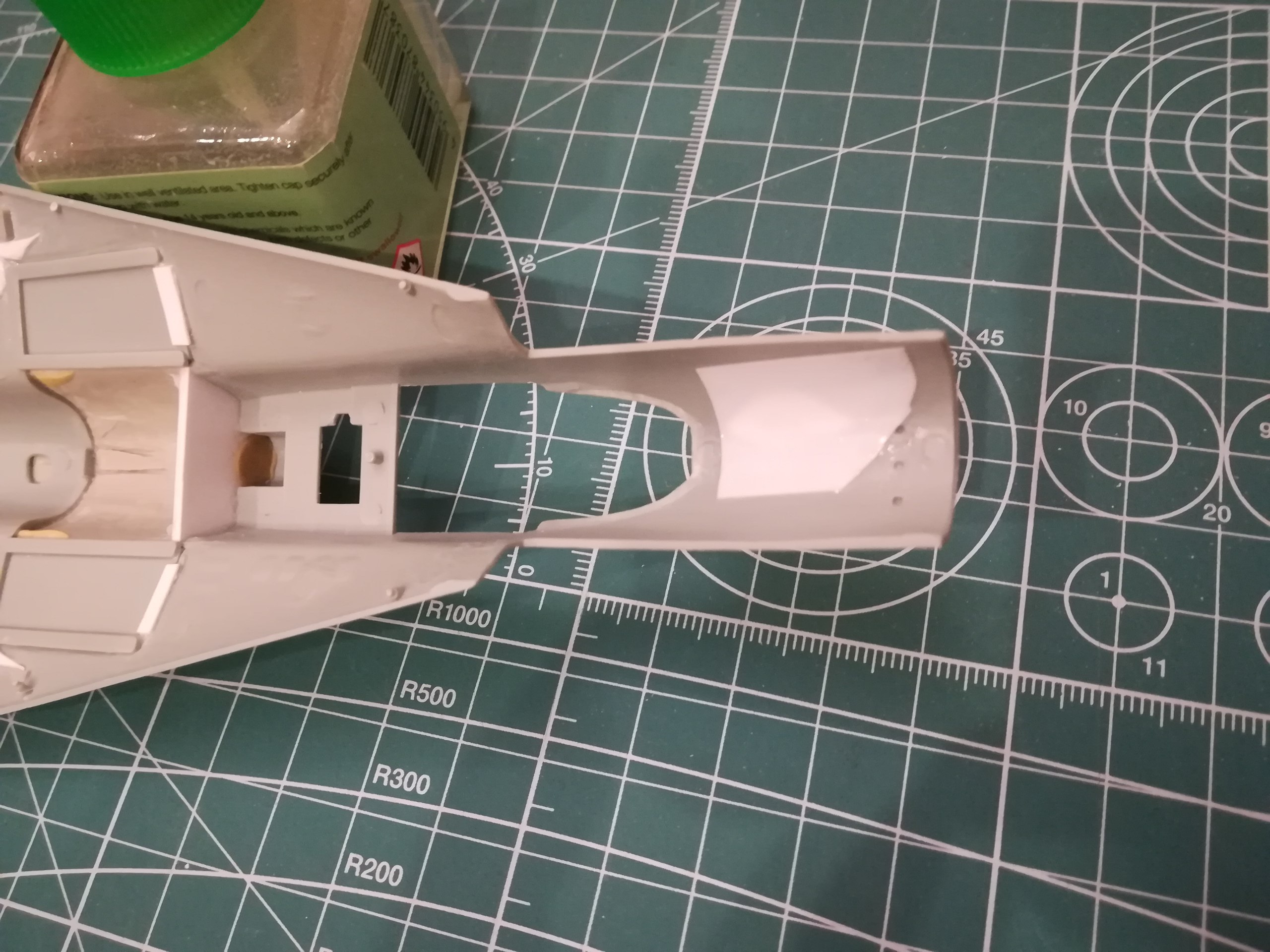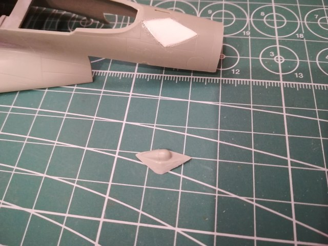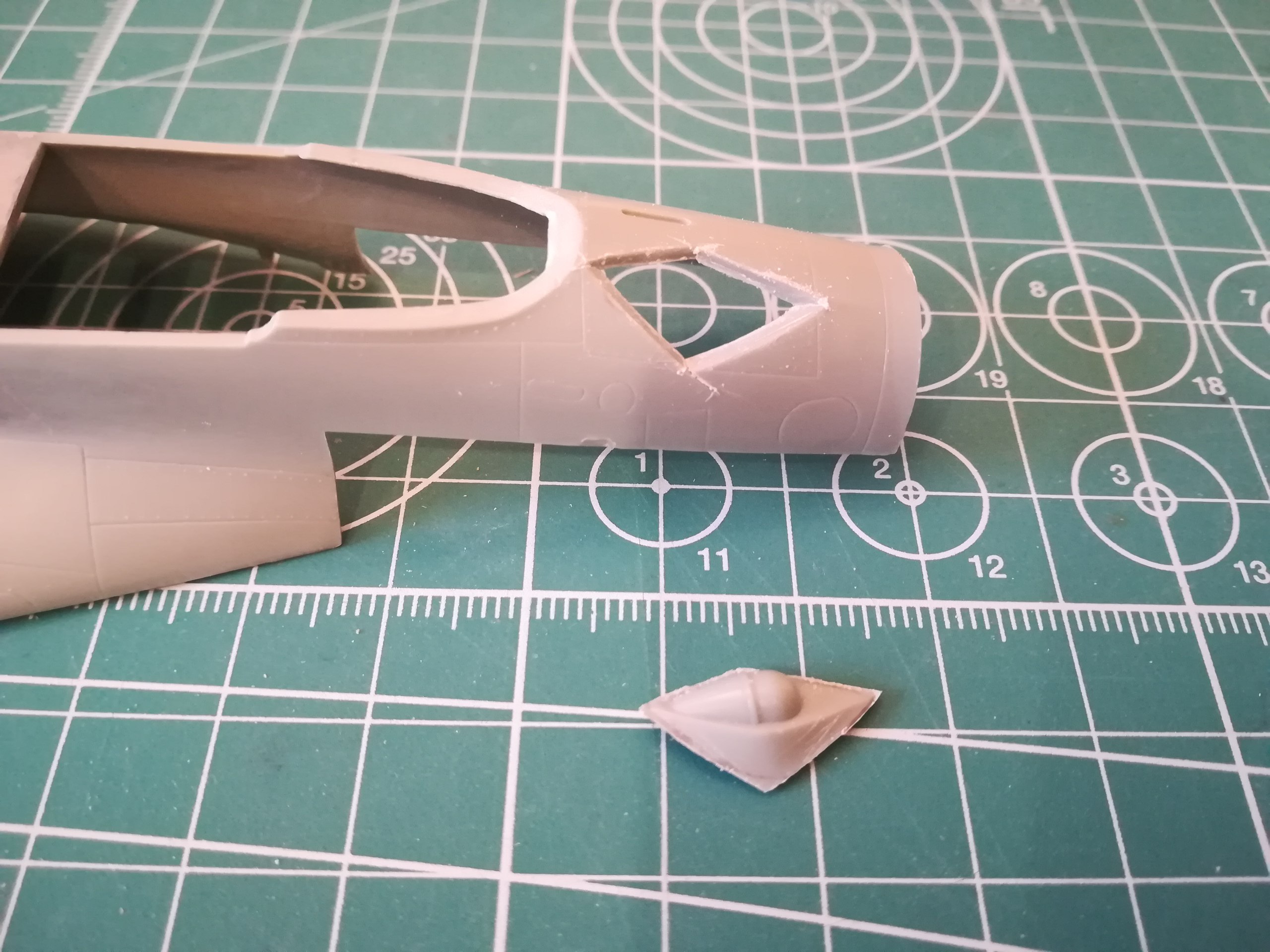 У модели оптико-локационная станция расположеа слишком далеко вперёди. Должна она располагаться у самого козырька кабины. Переносить её нужно вместе с обтекателем, иначе сам КОЛС будет смотреться не гармонично. По этому выпиливаю весь элемент пилочками от Тамии с небольшим припуском.