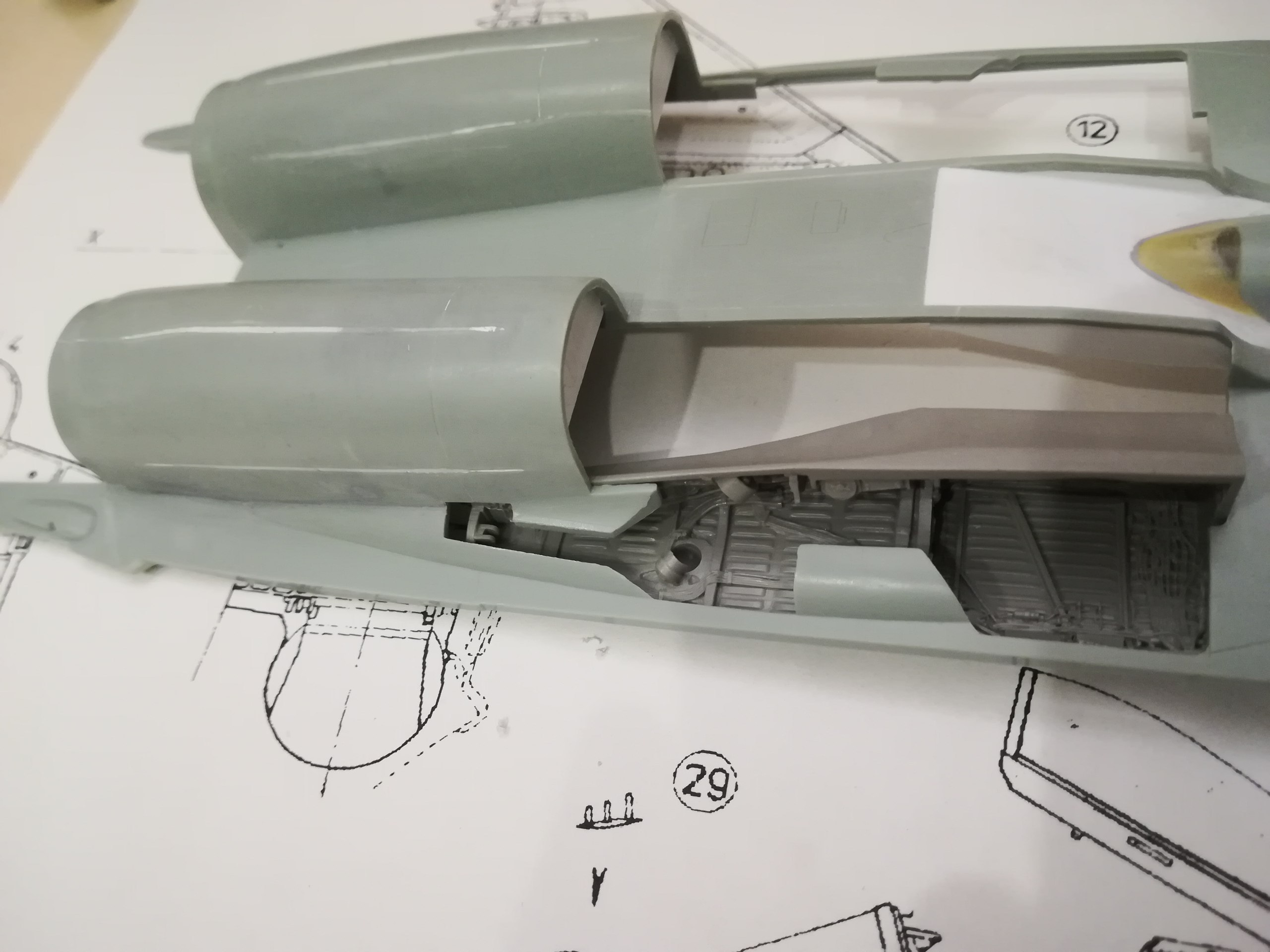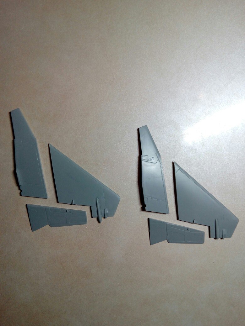 И ещё одно обстоятельство... Часть смоляной детали занимает такое положение внутри воздухозаборников, которое исключает имитацию его канала до первой ступени компрессора. А при закрытых верхних "жабрах", кои уже приклеены закрытыми, клин воздухозаборника должен быть поднят, и каналы его видны...