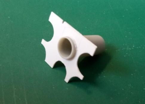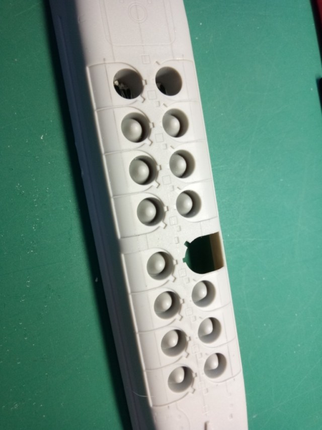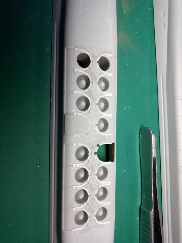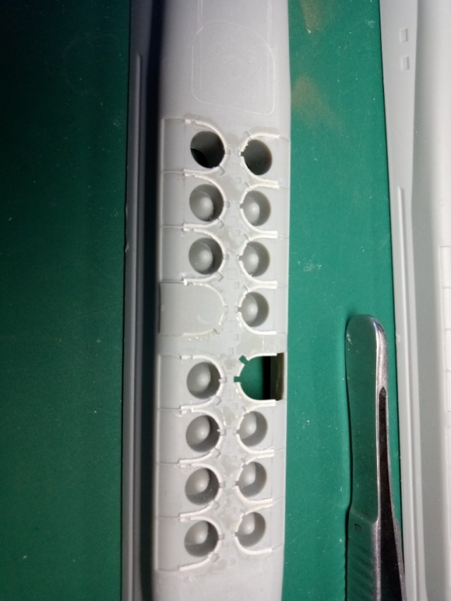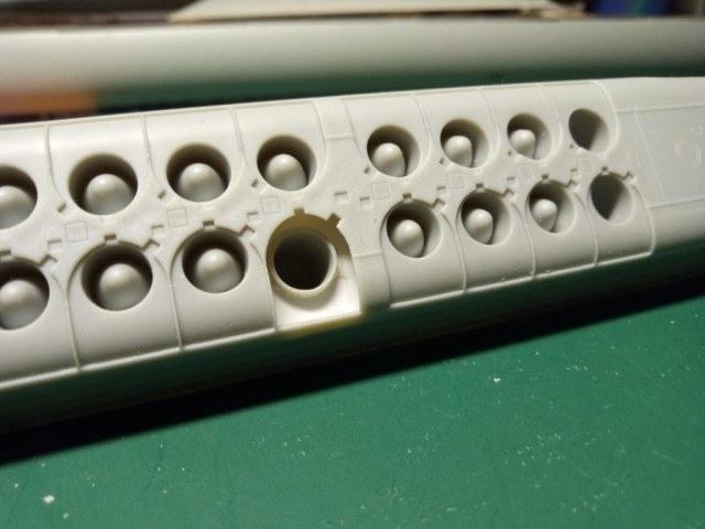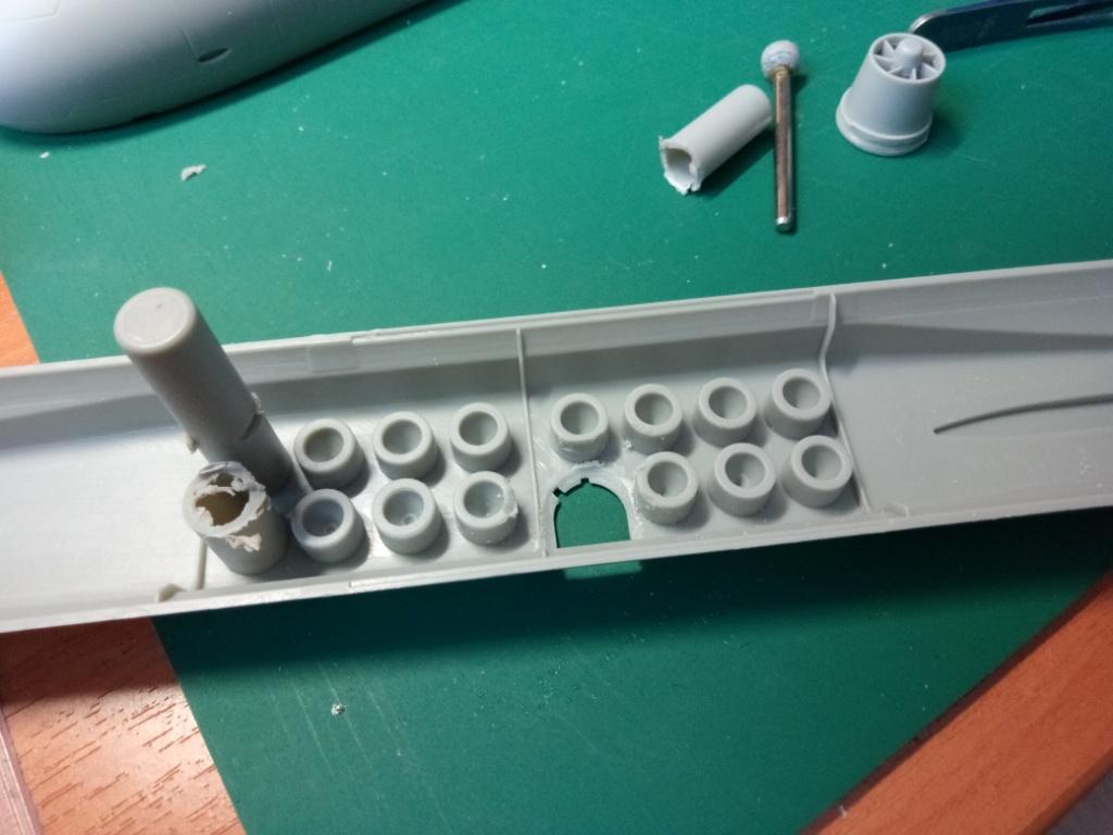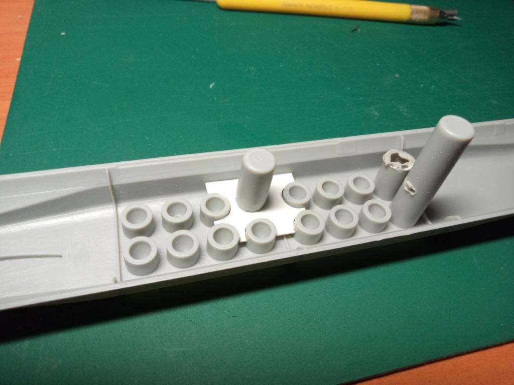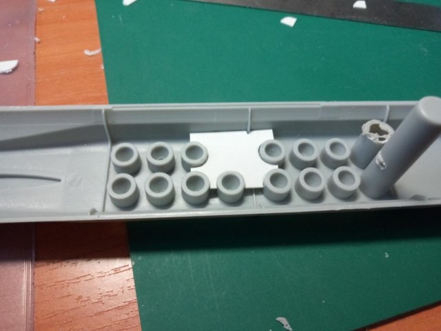 В первую очередь я вырезал первую попавшуюся шахту и сточил до максимума её края. Саму трубу шахты использовал от производителя - тупо срезал с кормовых установок. Получится немного короче по высоте, но это совсем не принципиально, т.к. ракета будет почти вся возвышаться над горбом модели.