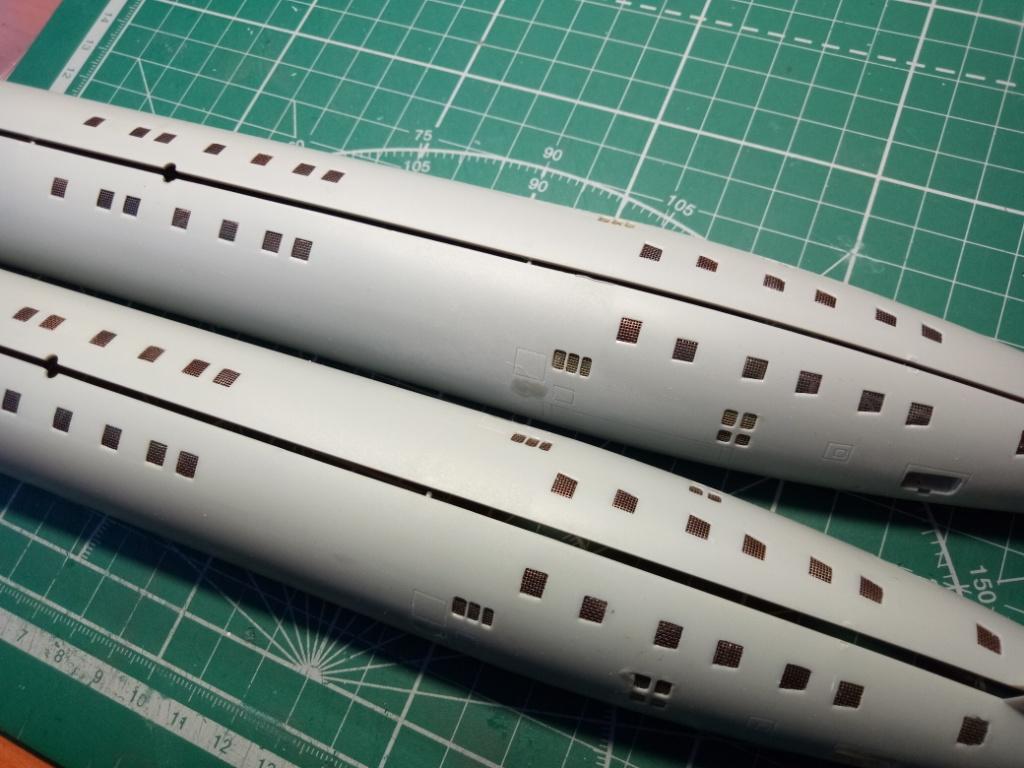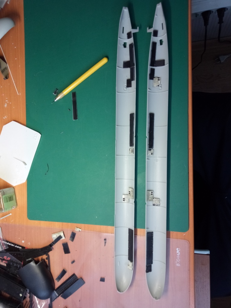 В местах врезки сеток, с обратной стороны, заклеил всё черным пластиком оставшимся от звездовских моделей лодок проекта 949А (Курск, Орел). Во первых тупо поленился красить пластик, во вторых так практичней-пластик толстый, ну и в третьих - от обломков надо как-то избавляться.
