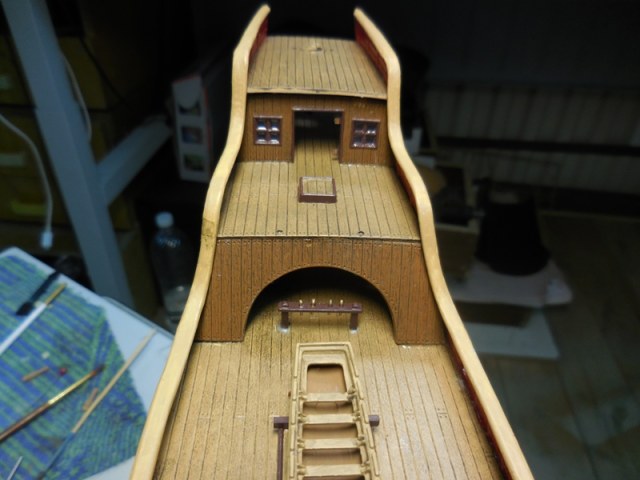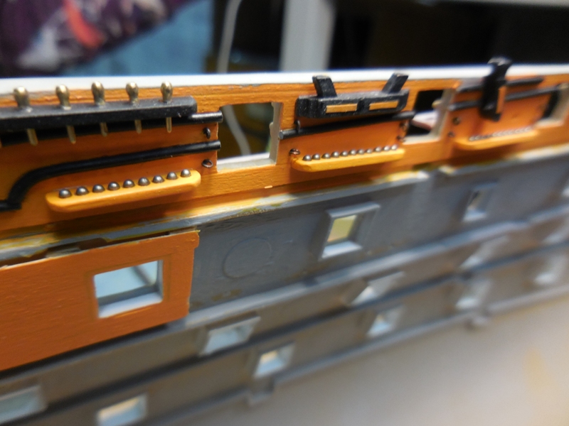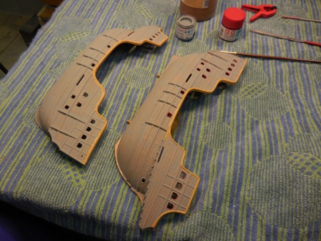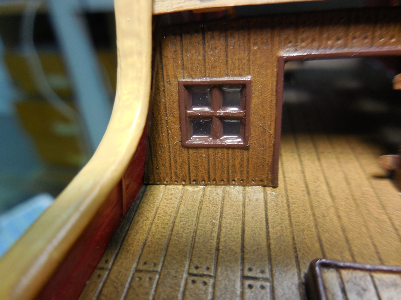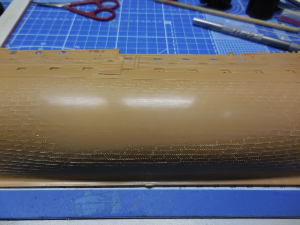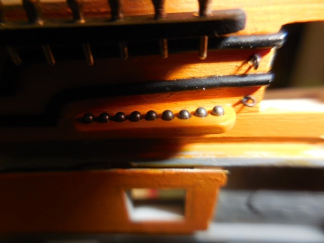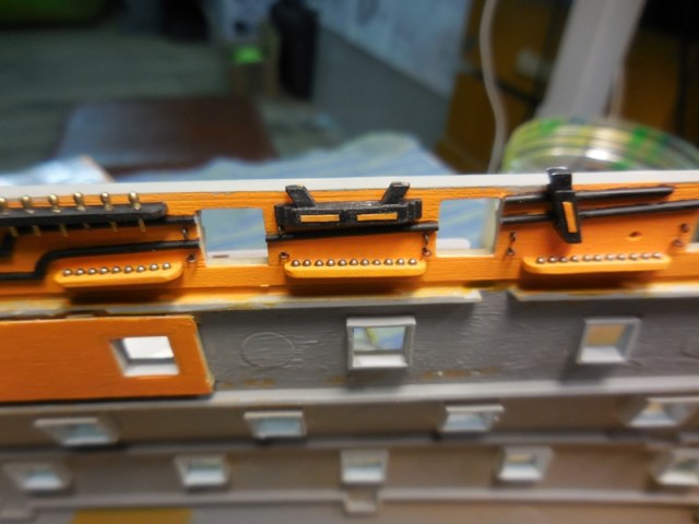 Спасибо за подсказки. На счет покраски под медь я тоже думал, но пока не о совместимости пластика с натуральными материалами, а о том, что если красить, то не будет такой выраженной рельефности обшивки. С другой стороны, мне всё таки первый вариант с рельефностью нравится. Почему не знаю, просто нравится. Пока есть ещё время на раздумья и пробы. Сейчас занимаюсь пробной обвязкой пушки, хочу попробовать имеющиеся у меня 2-х миллиметровые блоки. Я также думаю, что 2 мм это нормальный размер. На одной фотке реальной "Виктори" получилось пропорционально имеющимся деталям вычислить размер блоков на обвязке пушки на квартердеке. Получилось 220-230 мм. Так что, думаю, 2 мм блоки вполне подойдут. Ну а что получится на пробе - посмотрим...