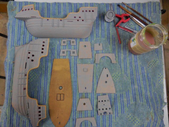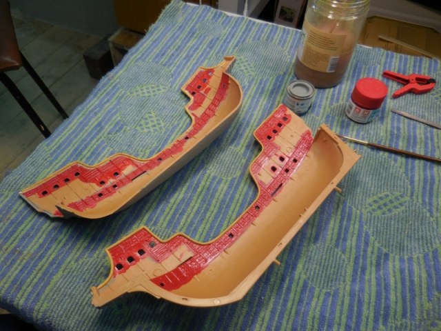 Сегодня в планах склеить половинки корпуса и палубу. Свою модель отложил пока... ну как можно отказать ребёнку!!!!